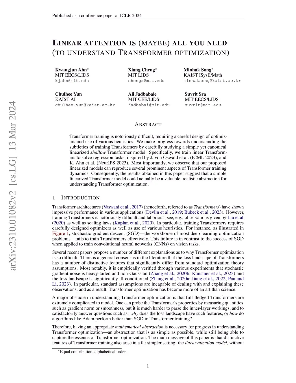 Transformer training is notoriously difficult, requiring a careful design of optimizers and use of various heuristics. We make progress towards understanding the subtleties of training Transformers by carefully studying a simple yet canonical linearized shallow Transformer model. Specifically, we train linear Transformers to solve regression tasks, inspired by J.~von Oswald et al.~(ICML 2023), and K.~Ahn et al.~(NeurIPS 2023). Most importantly, we observe that our proposed linearized models can reproduce several prominent aspects of Transformer training dynamics. Consequently, the results obtained in this paper suggest that a simple linearized Transformer model could actually be a valuable, realistic abstraction for understanding Transformer optimization.