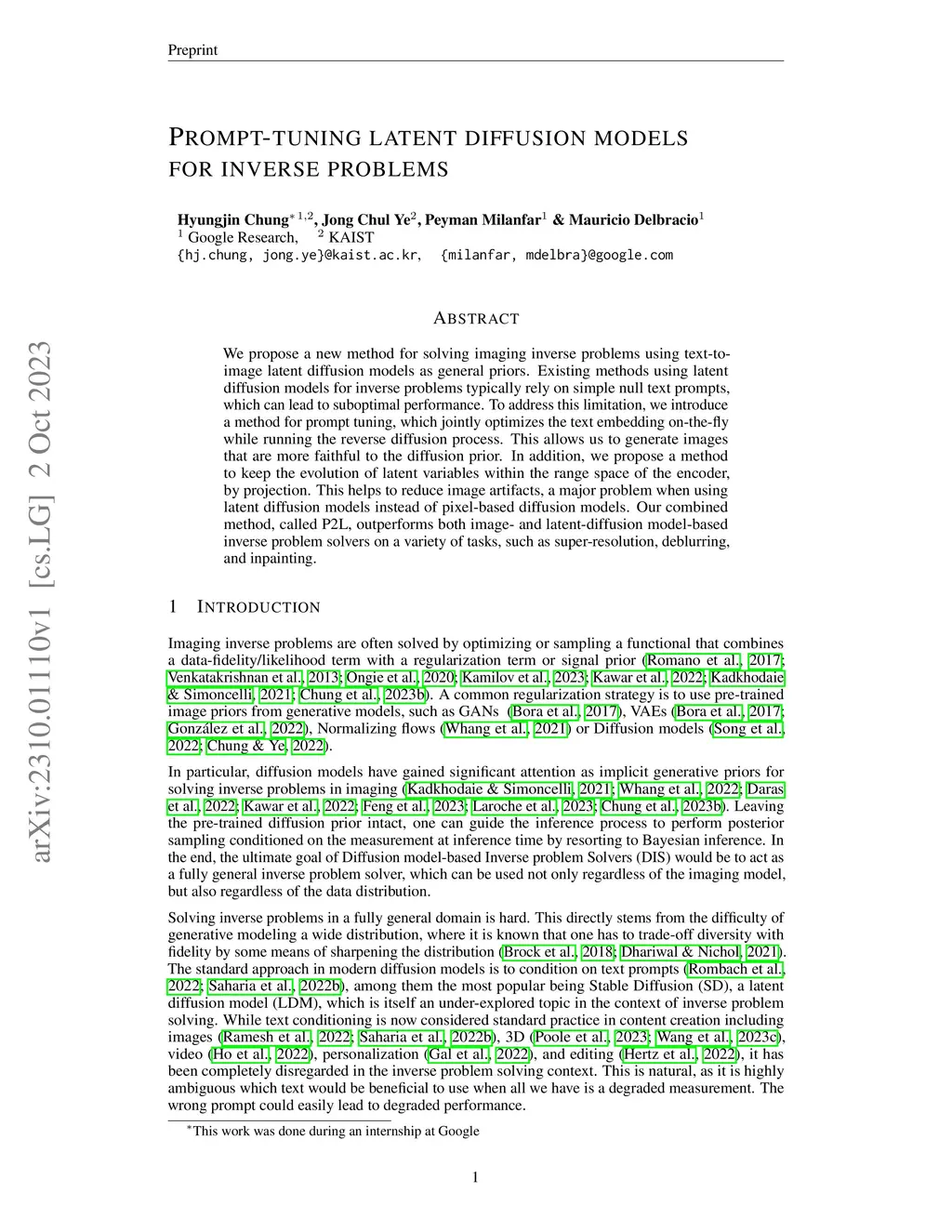 We propose a new method for solving imaging inverse problems using text-to-image latent diffusion models as general priors. Existing methods using latent diffusion models for inverse problems typically rely on simple null text prompts, which can lead to suboptimal performance. To address this limitation, we introduce a method for prompt tuning, which jointly optimizes the text embedding on-the-fly while running the reverse diffusion process. This allows us to generate images that are more faithful to the diffusion prior. In addition, we propose a method to keep the evolution of latent variables within the range space of the encoder, by projection. This helps to reduce image artifacts, a major problem when using latent diffusion models instead of pixel-based diffusion models. Our combined method, called P2L, outperforms both image- and latent-diffusion model-based inverse problem solvers on a variety of tasks, such as super-resolution, deblurring, and inpainting.