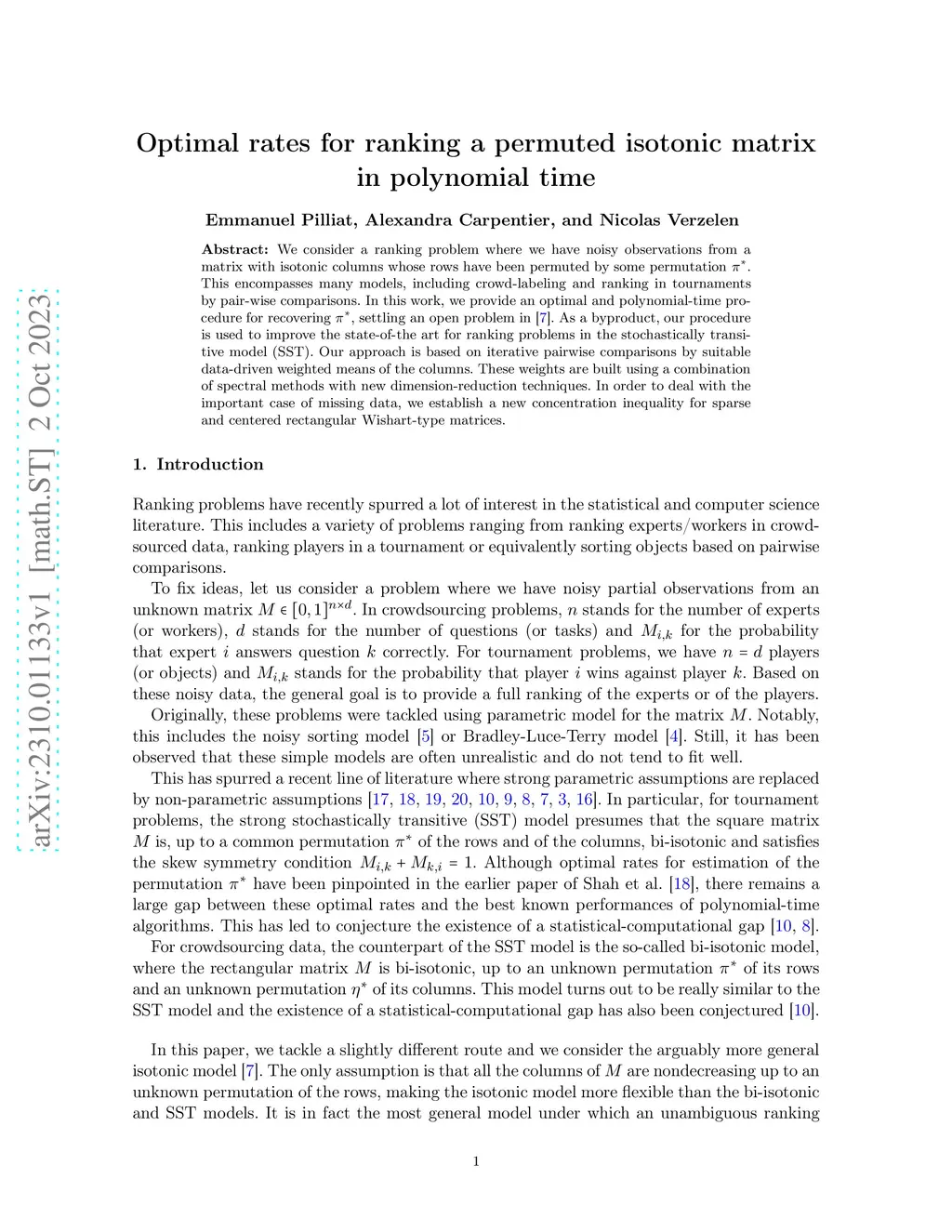 We consider a ranking problem where we have noisy observations from a matrix with isotonic columns whose rows have been permuted by some permutation *. This encompasses many models, including crowd-labeling and ranking in tournaments by pair-wise comparisons. In this work, we provide an optimal and polynomial-time procedure for recovering * , settling an open problem in [7]. As a byproduct, our procedure is used to improve the state-of-the art for ranking problems in the stochastically transitive model (SST). Our approach is based on iterative pairwise comparisons by suitable data-driven weighted means of the columns. These weights are built using a combination of spectral methods with new dimension-reduction techniques. In order to deal with the important case of missing data, we establish a new concentration inequality for sparse and centered rectangular Wishart-type matrices.