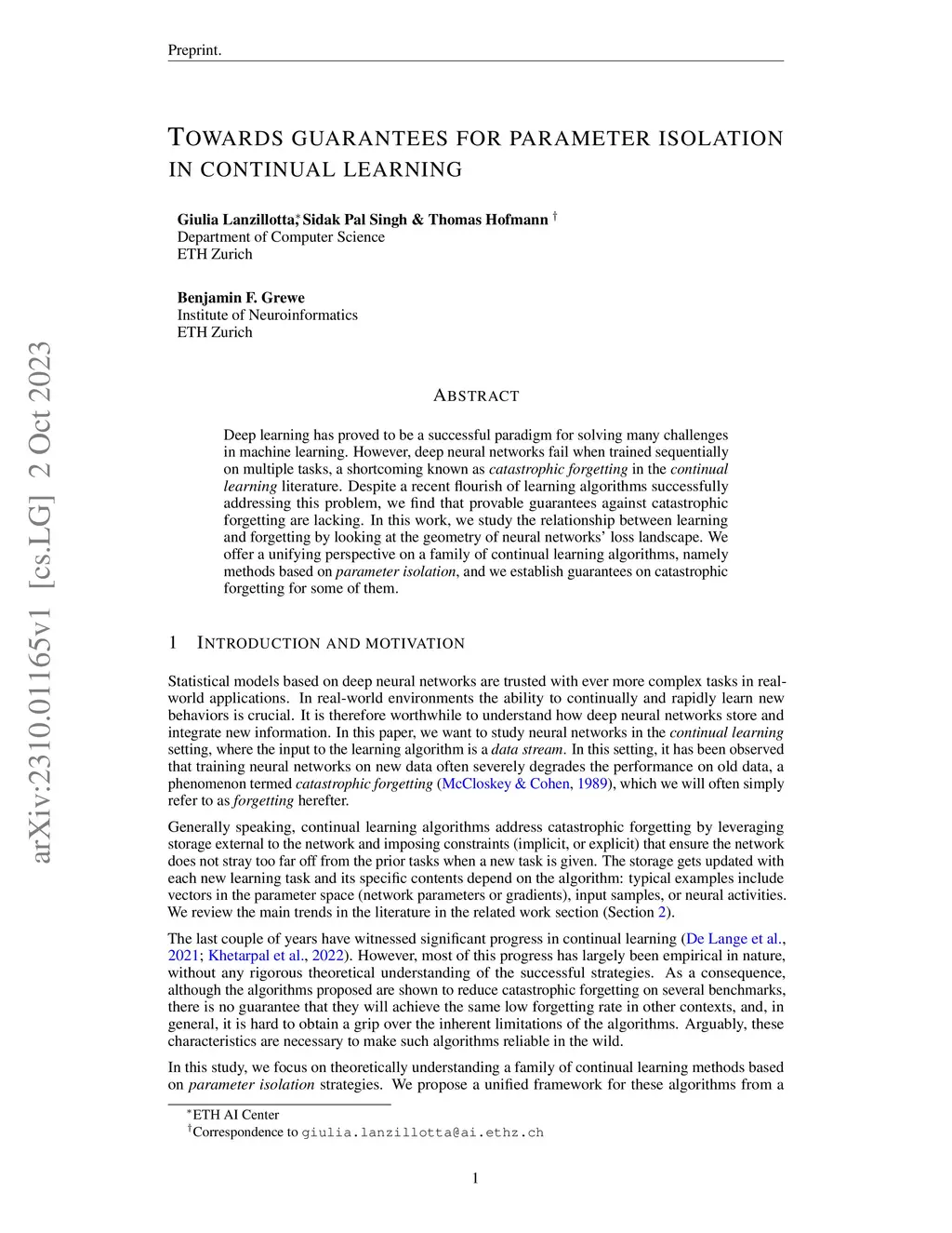 Deep learning has proved to be a successful paradigm for solving many challenges in machine learning. However, deep neural networks fail when trained sequentially on multiple tasks, a shortcoming known as catastrophic forgetting in the continual learning literature. Despite a recent flourish of learning algorithms successfully addressing this problem, we find that provable guarantees against catastrophic forgetting are lacking. In this work, we study the relationship between learning and forgetting by looking at the geometry of neural networks' loss landscape. We offer a unifying perspective on a family of continual learning algorithms, namely methods based on parameter isolation, and we establish guarantees on catastrophic forgetting for some of them.