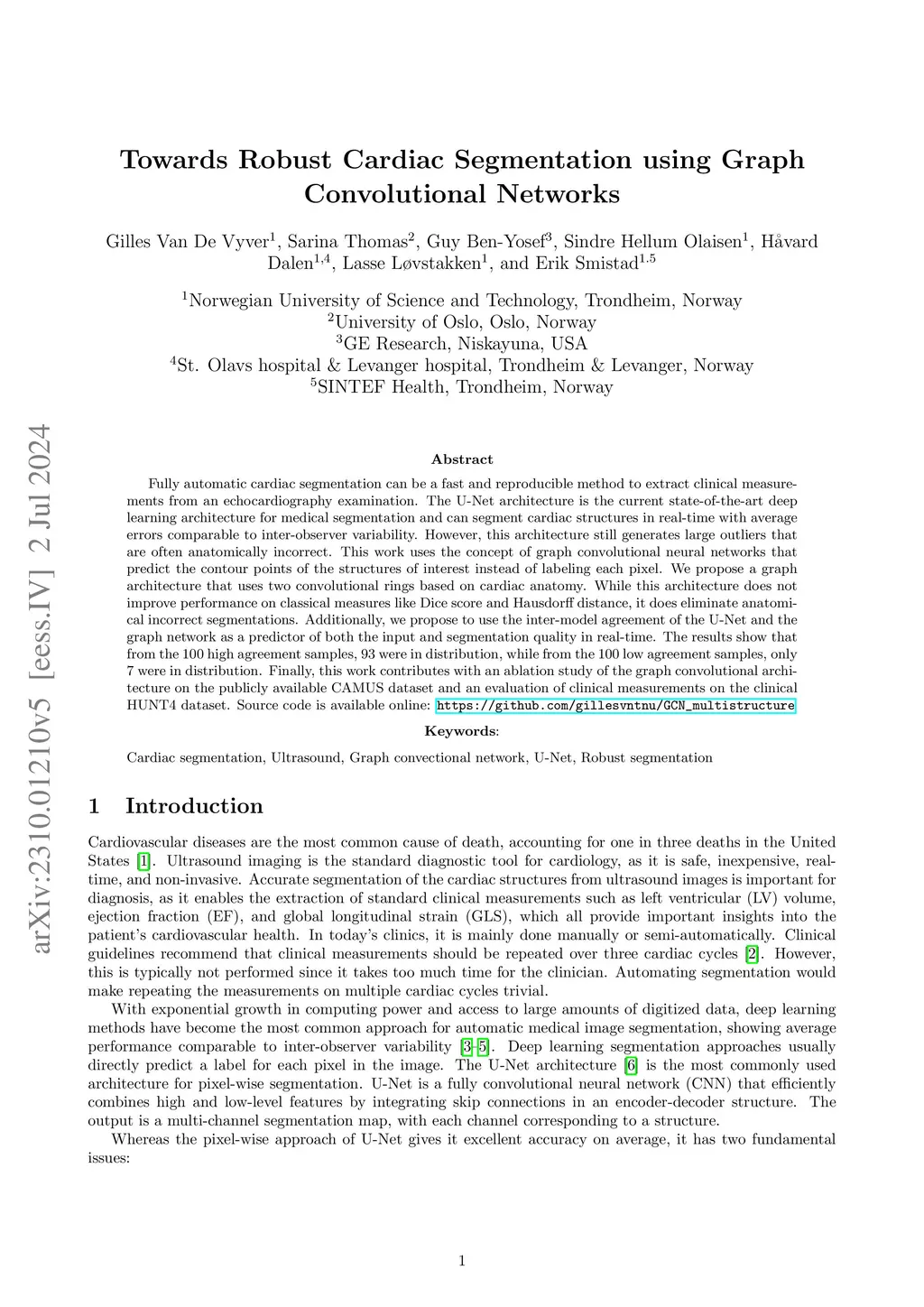 Fully automatic cardiac segmentation can be a fast and reproducible method to extract clinical measurements from an echocardiography examination. The U-Net architecture is the current state-of-the-art deep learning architecture for medical segmentation and can segment cardiac structures in real-time with average errors comparable to inter-observer variability. However, this architecture still generates large outliers that are often anatomically incorrect. This work uses the concept of graph convolutional neural networks that predict the contour points of the structures of interest instead of labeling each pixel. We propose a graph architecture that uses two convolutional rings based on cardiac anatomy and show that this eliminates anatomical incorrect multi-structure segmentations on the publicly available CAMUS dataset. Additionally, this work contributes with an ablation study on the graph convolutional architecture and an evaluation of clinical measurements on the clinical HUNT4 dataset. Finally, we propose to use the inter-model agreement of the U-Net and the graph network as a predictor of both the input and segmentation quality. We show this predictor can detect out-of-distribution and unsuitable input images in real-time. Source code is available online: https://github.com/gillesvntnu/GCN_multistructure