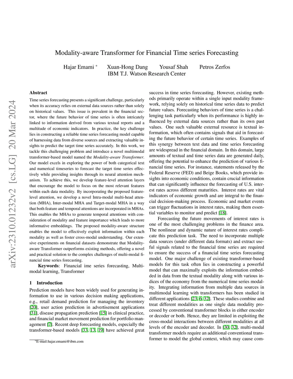 Time series forecasting presents a significant challenge, particularly when its accuracy relies on external data sources rather than solely on historical values. This issue is prevalent in the financial sector, where the future behavior of time series is often intricately linked to information derived from various textual reports and a multitude of economic indicators. In practice, the key challenge lies in constructing a reliable time series forecasting model capable of harnessing data from diverse sources and extracting valuable insights to predict the target time series accurately. In this work, we tackle this challenging problem and introduce a novel multimodal transformer-based model named the \textit{Modality-aware Transformer}. Our model excels in exploring the power of both categorical text and numerical timeseries to forecast the target time series effectively while providing insights through its neural attention mechanism. To achieve this, we develop feature-level attention layers that encourage the model to focus on the most relevant features within each data modality. By incorporating the proposed feature-level attention, we develop a novel Intra-modal multi-head attention (MHA), Inter-modal MHA and Target-modal MHA in a way that both feature and temporal attentions are incorporated in MHAs. This enables the MHAs to generate temporal attentions with consideration of modality and feature importance which leads to more informative embeddings. The proposed modality-aware structure enables the model to effectively exploit information within each modality as well as foster cross-modal understanding. Our extensive experiments on financial datasets demonstrate that Modality-aware Transformer outperforms existing methods, offering a novel and practical solution to the complex challenges of multi-modal financial time series forecasting.
