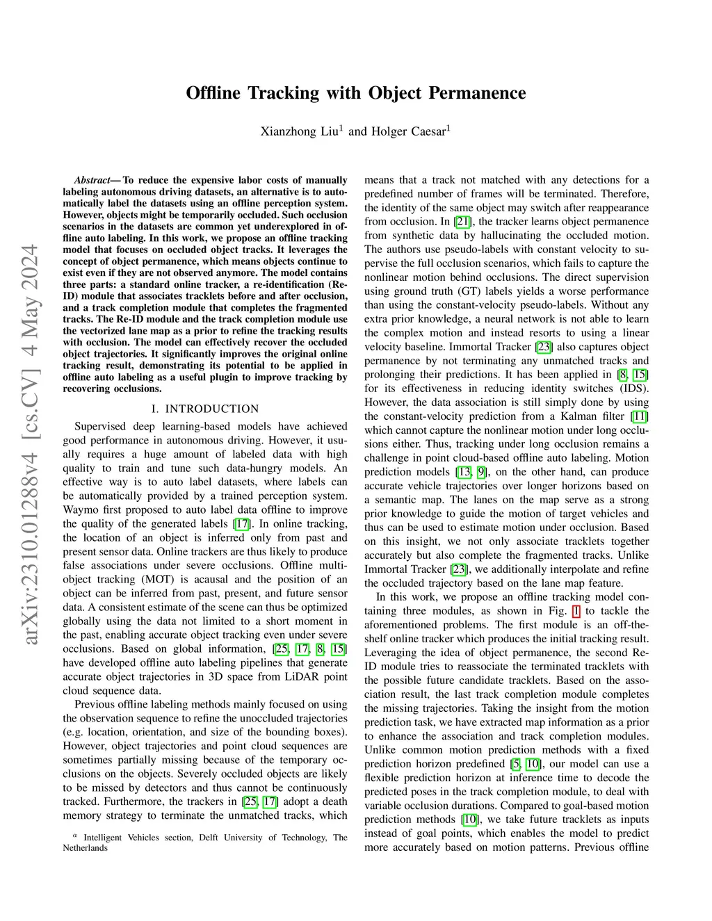 To reduce the expensive labor cost for manual labeling autonomous driving datasets, an alternative is to automatically label the datasets using an offline perception system. However, objects might be temporally occluded. Such occlusion scenarios in the datasets are common yet underexplored in offline auto labeling. In this work, we propose an offline tracking model that focuses on occluded object tracks. It leverages the concept of object permanence which means objects continue to exist even if they are not observed anymore. The model contains three parts: a standard online tracker, a re-identification (Re-ID) module that associates tracklets before and after occlusion, and a track completion module that completes the fragmented tracks. The Re-ID module and the track completion module use the vectorized map as one of the inputs to refine the tracking results with occlusion. The model can effectively recover the occluded object trajectories. It achieves state-of-the-art performance in 3D multi-object tracking by significantly improving the original online tracking result, showing its potential to be applied in offline auto labeling as a useful plugin to improve tracking by recovering occlusions.