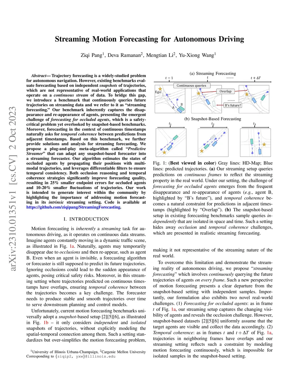 Trajectory forecasting is a widely-studied problem for autonomous navigation. However, existing benchmarks evaluate forecasting based on independent snapshots of trajectories, which are not representative of real-world applications that operate on a continuous stream of data. To bridge this gap, we introduce a benchmark that continuously queries future trajectories on streaming data and we refer to it as "streaming forecasting." Our benchmark inherently captures the disappearance and re-appearance of agents, presenting the emergent challenge of forecasting for occluded agents, which is a safety-critical problem yet overlooked by snapshot-based benchmarks. Moreover, forecasting in the context of continuous timestamps naturally asks for temporal coherence between predictions from adjacent timestamps. Based on this benchmark, we further provide solutions and analysis for streaming forecasting. We propose a plug-and-play meta-algorithm called "Predictive Streamer" that can adapt any snapshot-based forecaster into a streaming forecaster. Our algorithm estimates the states of occluded agents by propagating their positions with multi-modal trajectories, and leverages differentiable filters to ensure temporal consistency. Both occlusion reasoning and temporal coherence strategies significantly improve forecasting quality, resulting in 25% smaller endpoint errors for occluded agents and 10-20% smaller fluctuations of trajectories. Our work is intended to generate interest within the community by highlighting the importance of addressing motion forecasting in its intrinsic streaming setting. Code is available at https://github.com/ziqipang/StreamingForecasting.