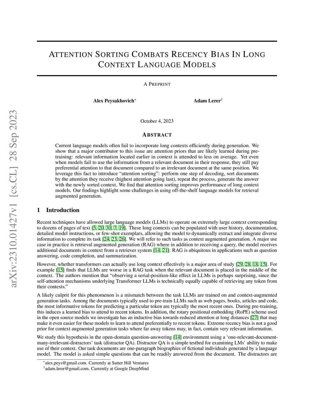 Current language models often fail to incorporate long contexts efficiently during generation. We show that a major contributor to this issue are attention priors that are likely learned during pre-training: relevant information located earlier in context is attended to less on average. Yet even when models fail to use the information from a relevant document in their response, they still pay preferential attention to that document compared to an irrelevant document at the same position. We leverage this fact to introduce ``attention sorting'': perform one step of decoding, sort documents by the attention they receive (highest attention going last), repeat the process, generate the answer with the newly sorted context. We find that attention sorting improves performance of long context models. Our findings highlight some challenges in using off-the-shelf language models for retrieval augmented generation.