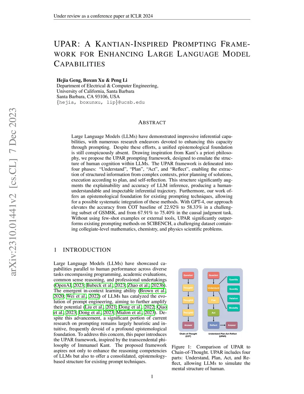 Large Language Models (LLMs) have demonstrated impressive inferential capabilities, with numerous research endeavors devoted to enhancing this capacity through prompting. Despite these efforts, a unified epistemological foundation is still conspicuously absent. Drawing inspiration from Kant's a priori philosophy, we propose the UPAR prompting framework, designed to emulate the structure of human cognition within LLMs. The UPAR framework is delineated into four phases: "Understand", "Plan", "Act", and "Reflect", enabling the extraction of structured information from complex contexts, prior planning of solutions, execution according to plan, and self-reflection. This structure significantly augments the explainability and accuracy of LLM inference, producing a human-understandable and inspectable inferential trajectory. Furthermore, our work offers an epistemological foundation for existing prompting techniques, allowing for a possible systematic integration of these methods. With GPT-4, our approach elevates the accuracy from COT baseline of 22.92% to 58.33% in a challenging subset of GSM8K, and from 67.91% to 75.40% in the causal judgment task. Without using few-shot examples or external tools, UPAR significantly outperforms existing prompting methods on SCIBENCH, a challenging dataset containing collegiate-level mathematics, chemistry, and physics scientific problems.