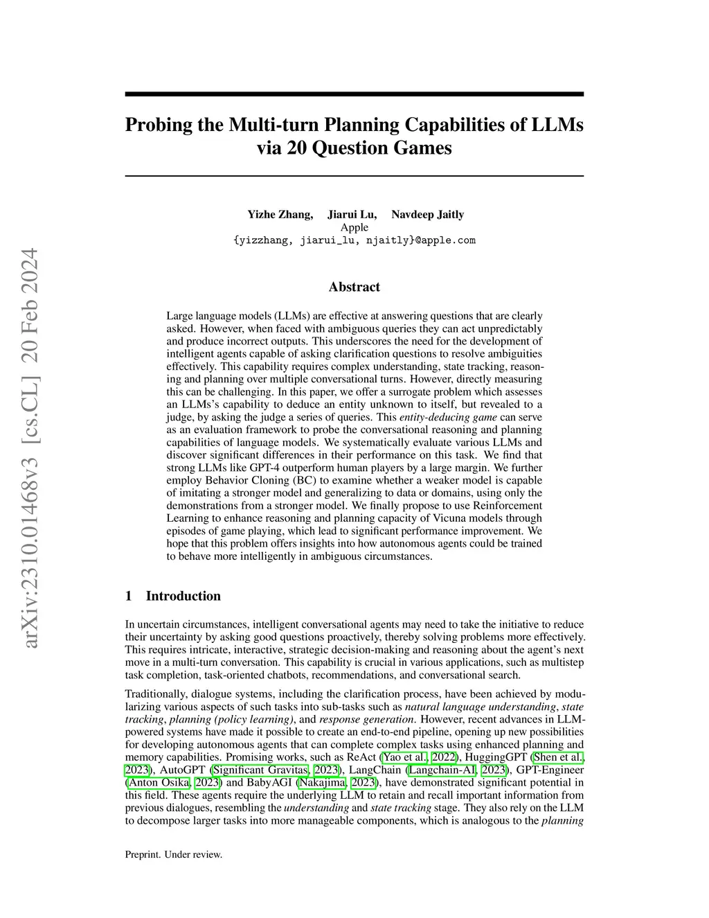 Large language models (LLMs) are effective at answering questions that are clearly asked. However, when faced with ambiguous queries they can act unpredictably and produce incorrect outputs. This underscores the need for the development of intelligent agents capable of asking clarification questions to resolve ambiguities effectively. This capability requires complex understanding, state tracking, reasoning and planning over multiple conversational turns. However, directly measuring this can be challenging. In this paper, we offer a surrogate problem which assesses an LLMs's capability to deduce an entity unknown to itself, but revealed to a judge, by asking the judge a series of queries. This \textit{entity-deducing game} can serve as an evaluation framework to probe the conversational reasoning and planning capabilities of language models. We systematically evaluate various LLMs and discover significant differences in their performance on this task. We find that strong LLMs like GPT-4 outperform human players by a large margin. We further employ Behavior Cloning (BC) to examine whether a weaker model is capable of imitating a stronger model and generalizing to data or domains, using only the demonstrations from a stronger model. We finally propose to use Reinforcement Learning to enhance reasoning and planning capacity of Vicuna models through episodes of game playing, which lead to significant performance improvement. We hope that this problem offers insights into how autonomous agents could be trained to behave more intelligently in ambiguous circumstances.