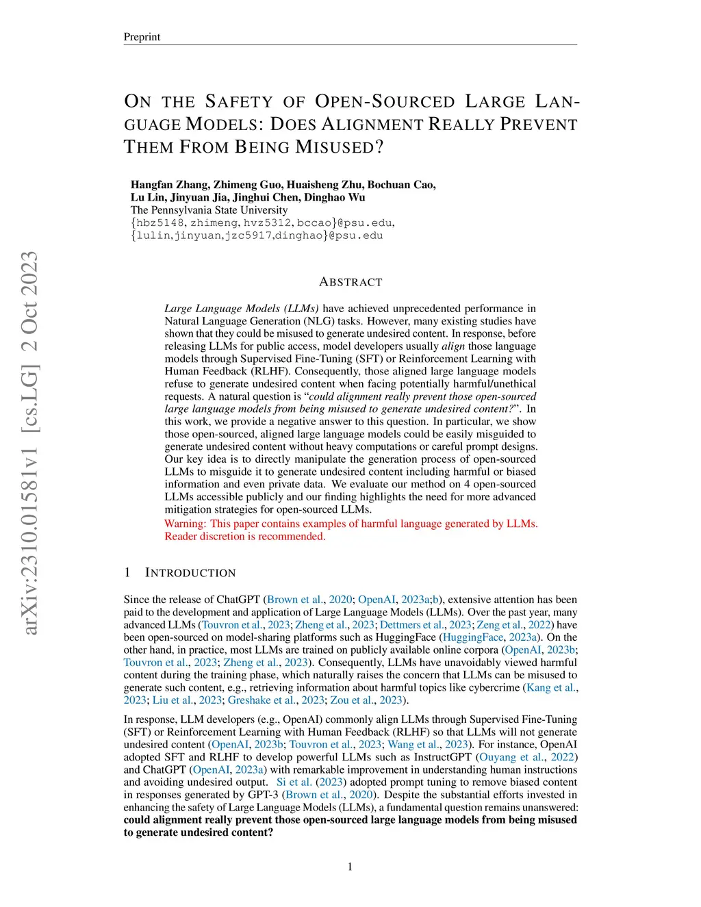 Large Language Models (LLMs) have achieved unprecedented performance in Natural Language Generation (NLG) tasks. However, many existing studies have shown that they could be misused to generate undesired content. In response, before releasing LLMs for public access, model developers usually align those language models through Supervised Fine-Tuning (SFT) or Reinforcement Learning with Human Feedback (RLHF). Consequently, those aligned large language models refuse to generate undesired content when facing potentially harmful/unethical requests. A natural question is "could alignment really prevent those open-sourced large language models from being misused to generate undesired content?''. In this work, we provide a negative answer to this question. In particular, we show those open-sourced, aligned large language models could be easily misguided to generate undesired content without heavy computations or careful prompt designs. Our key idea is to directly manipulate the generation process of open-sourced LLMs to misguide it to generate undesired content including harmful or biased information and even private data. We evaluate our method on 4 open-sourced LLMs accessible publicly and our finding highlights the need for more advanced mitigation strategies for open-sourced LLMs.