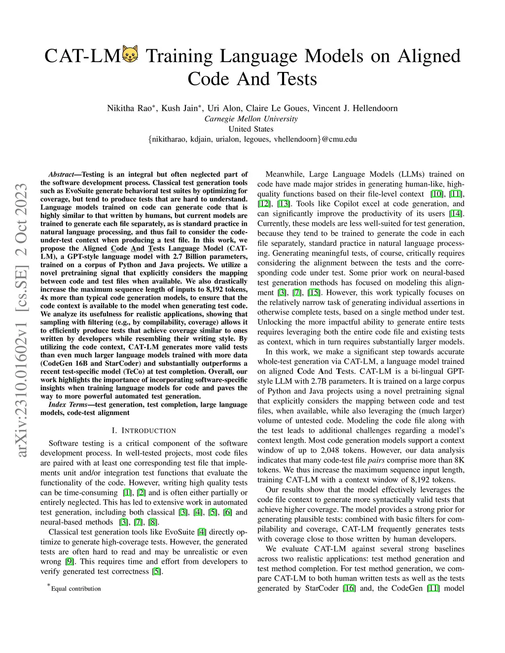 CAT-LM: Training Language Models on Aligned Code And Tests