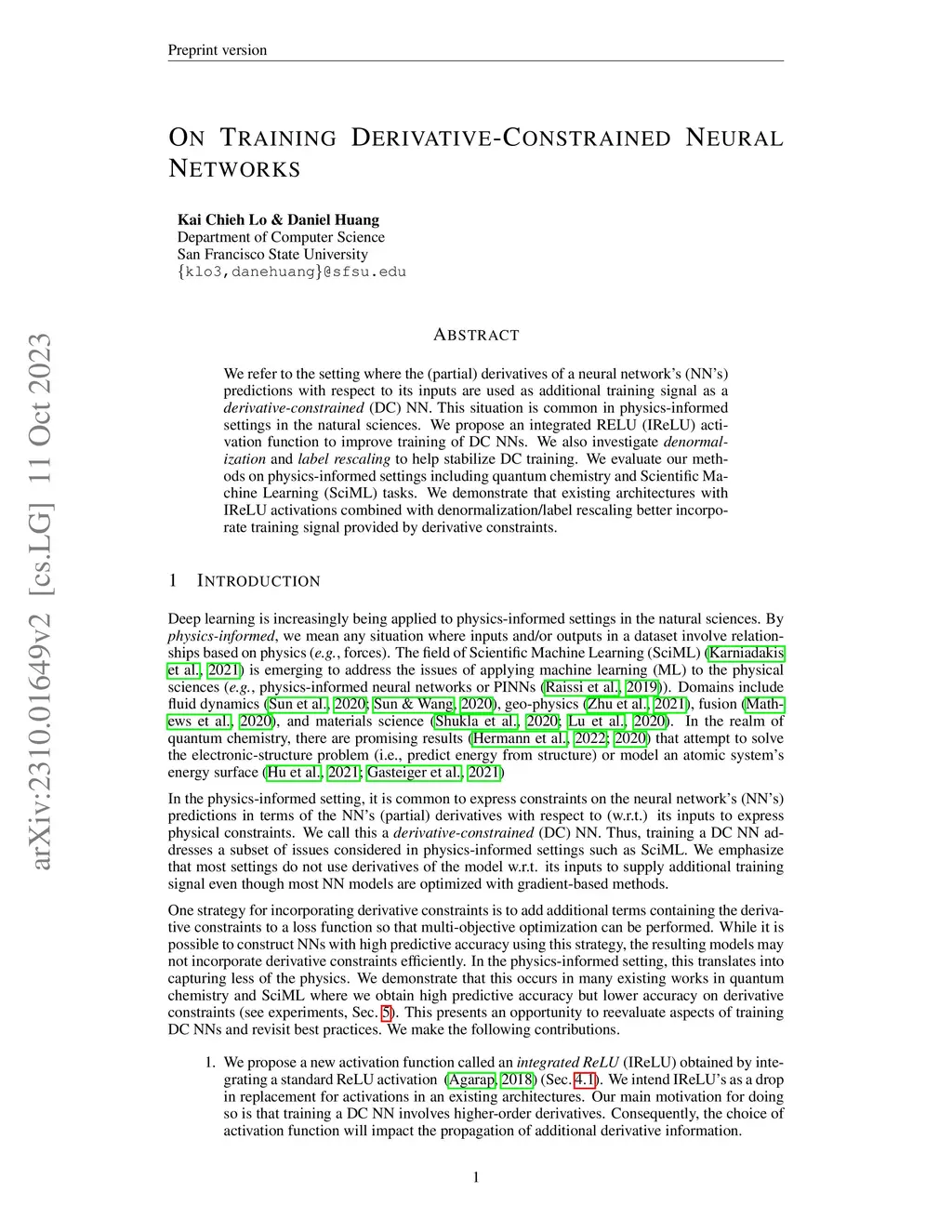 We refer to the setting where the (partial) derivatives of a neural network's (NN's) predictions with respect to its inputs are used as additional training signal as a derivative-constrained (DC) NN. This situation is common in physics-informed settings in the natural sciences. We propose an integrated RELU (IReLU) activation function to improve training of DC NNs. We also investigate denormalization and label rescaling to help stabilize DC training. We evaluate our methods on physics-informed settings including quantum chemistry and Scientific Machine Learning (SciML) tasks. We demonstrate that existing architectures with IReLU activations combined with denormalization and label rescaling better incorporate training signal provided by derivative constraints.