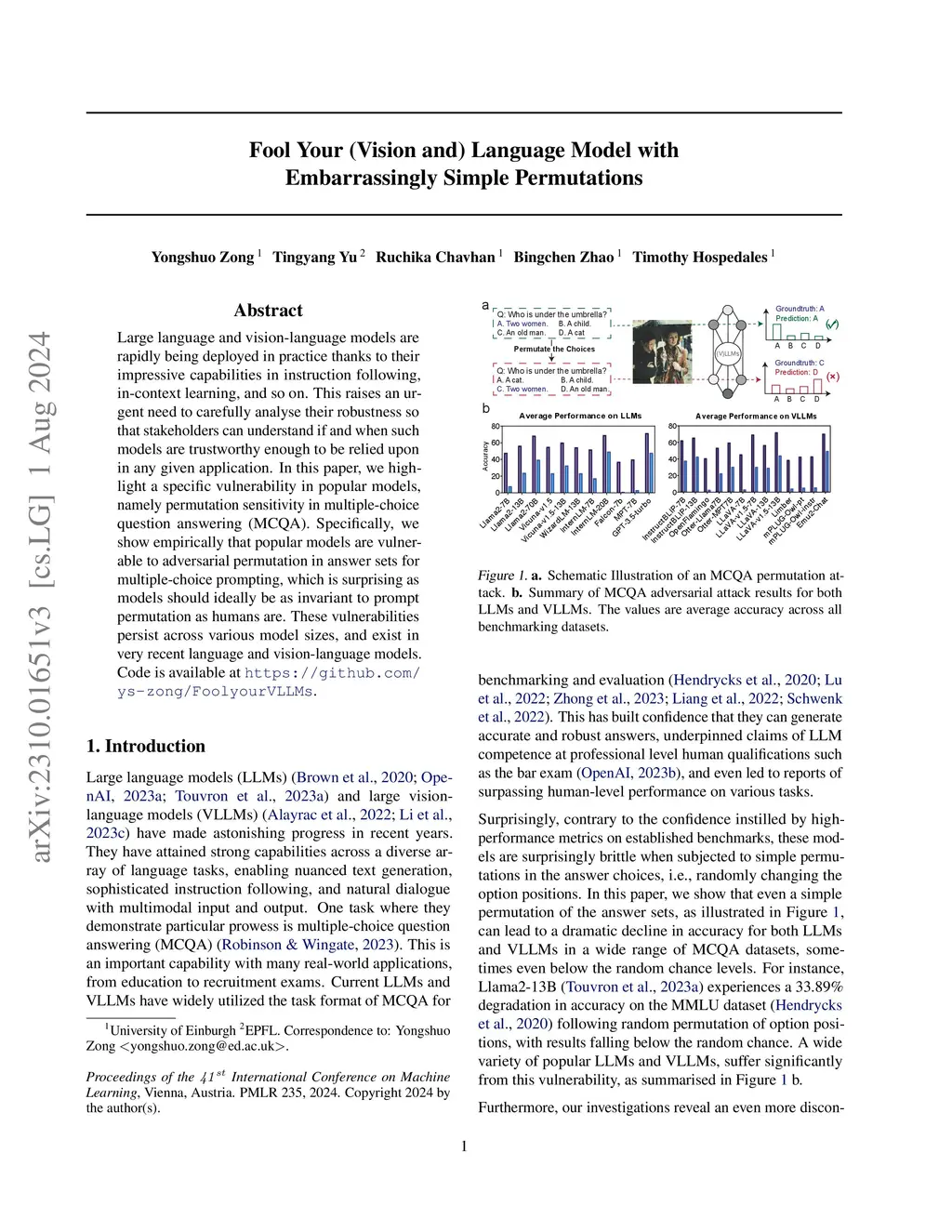 Large language and vision-language models are rapidly being deployed in practice thanks to their impressive capabilities in instruction following, in-context learning, and so on. This raises an urgent need to carefully analyse their robustness so that stakeholders can understand if and when such models are trustworthy enough to be relied upon in any given application. In this paper, we highlight a specific vulnerability in popular models, namely permutation sensitivity in multiple-choice question answering (MCQA). Specifically, we show empirically that popular models are vulnerable to adversarial permutation in answer sets for multiple-choice prompting, which is surprising as models should ideally be as invariant to prompt permutation as humans are. These vulnerabilities persist across various model sizes, and exist in very recent language and vision-language models. Code is available at https://github.com/ys-zong/FoolyourVLLMs.