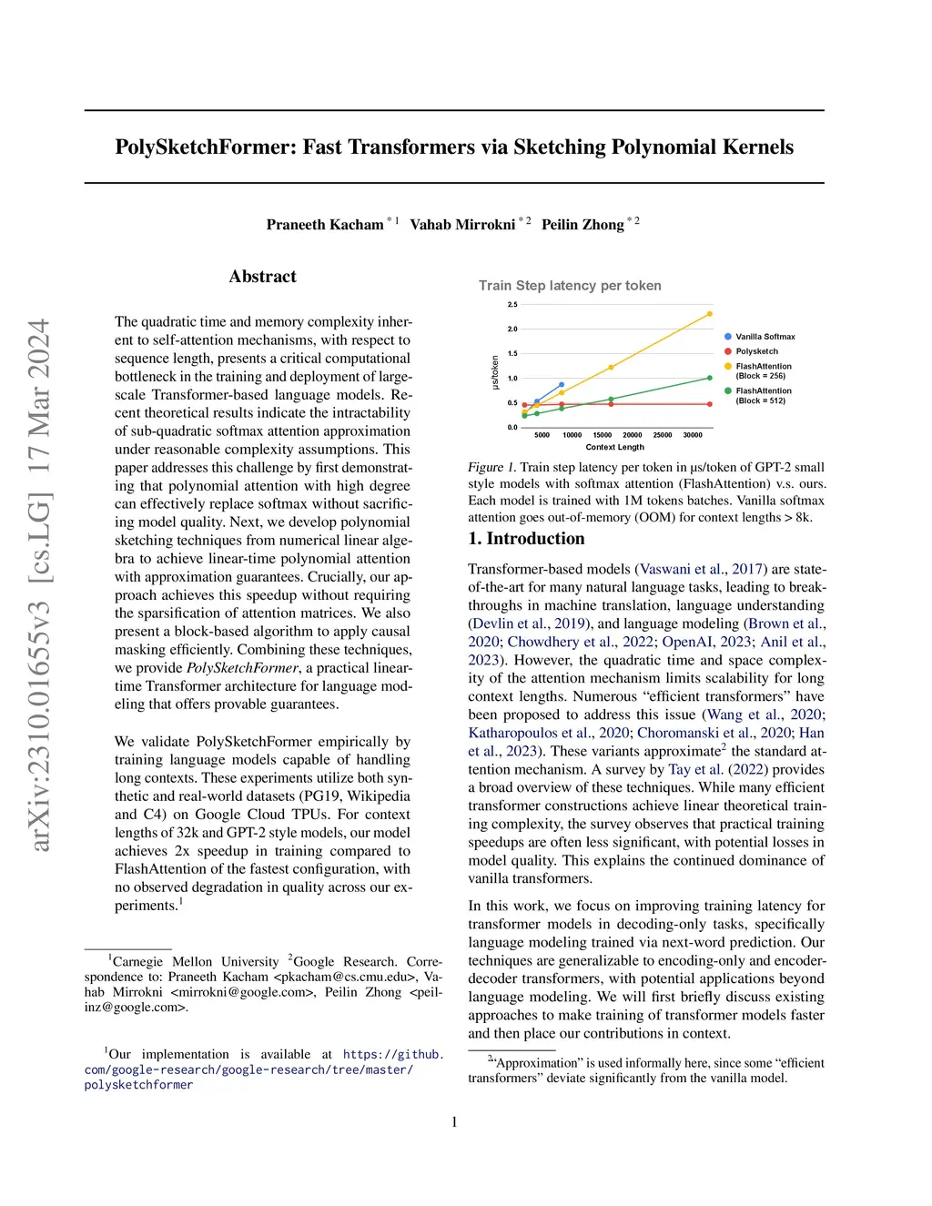 The quadratic time and memory complexity inherent to self-attention mechanisms, with respect to sequence length, presents a critical computational bottleneck in the training and deployment of large-scale Transformer-based language models. Recent theoretical results indicate the intractability of sub-quadratic softmax attention approximation under reasonable complexity assumptions. This paper addresses this challenge by first demonstrating that polynomial attention with high degree can effectively replace softmax without sacrificing model quality. Next, we develop polynomial sketching techniques from numerical linear algebra to achieve linear-time polynomial attention with approximation guarantees. Crucially, our approach achieves this speedup without requiring the sparsification of attention matrices. We also present a block-based algorithm to apply causal masking efficiently. Combining these techniques, we provide \emph{PolySketchFormer}, a practical linear-time Transformer architecture for language modeling that offers provable guarantees. We validate PolySketchFormer empirically by training language models capable of handling long contexts. These experiments utilize both synthetic and real-world datasets (PG19, Wikipedia and C4) on Google Cloud TPUs. For context lengths of 32k and GPT-2 style models, our model achieves a 2.5-4x speedup in training compared to FlashAttention, with no observed degradation in quality across our experiments.