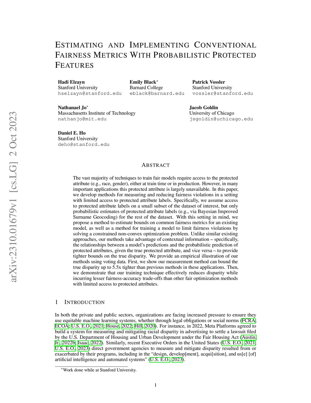 The vast majority of techniques to train fair models require access to the protected attribute (e.g., race, gender), either at train time or in production. However, in many important applications this protected attribute is largely unavailable. In this paper, we develop methods for measuring and reducing fairness violations in a setting with limited access to protected attribute labels. Specifically, we assume access to protected attribute labels on a small subset of the dataset of interest, but only probabilistic estimates of protected attribute labels (e.g., via Bayesian Improved Surname Geocoding) for the rest of the dataset. With this setting in mind, we propose a method to estimate bounds on common fairness metrics for an existing model, as well as a method for training a model to limit fairness violations by solving a constrained non-convex optimization problem. Unlike similar existing approaches, our methods take advantage of contextual information -- specifically, the relationships between a model's predictions and the probabilistic prediction of protected attributes, given the true protected attribute, and vice versa -- to provide tighter bounds on the true disparity. We provide an empirical illustration of our methods using voting data. First, we show our measurement method can bound the true disparity up to 5.5x tighter than previous methods in these applications. Then, we demonstrate that our training technique effectively reduces disparity while incurring lesser fairness-accuracy trade-offs than other fair optimization methods with limited access to protected attributes.