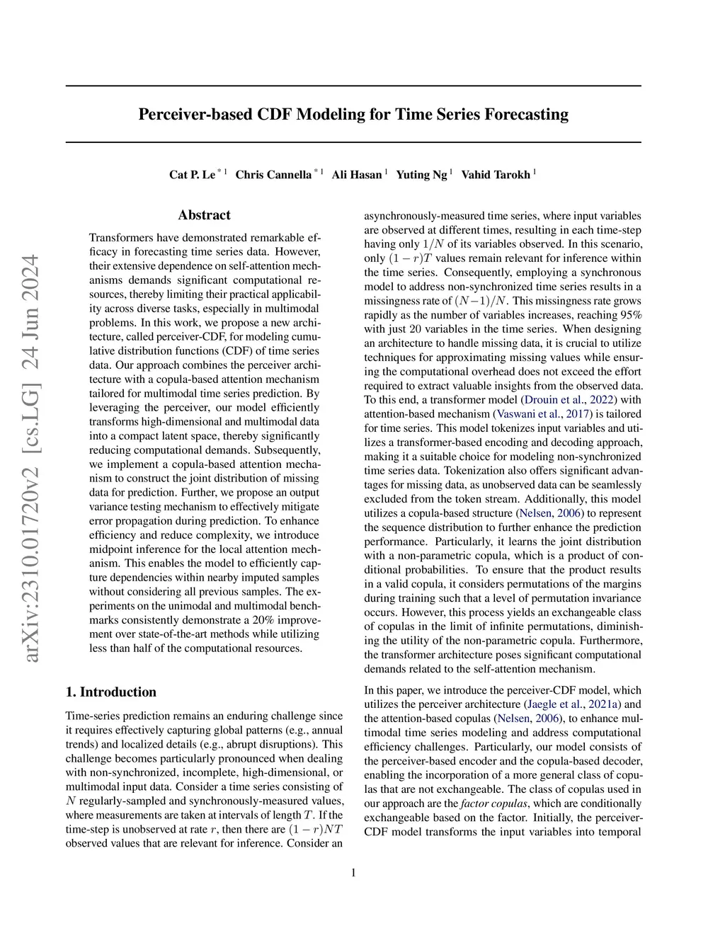 Transformers have demonstrated remarkable efficacy in forecasting time series data. However, their extensive dependence on self-attention mechanisms demands significant computational resources, thereby limiting their practical applicability across diverse tasks, especially in multimodal problems. In this work, we propose a new architecture, called perceiver-CDF, for modeling cumulative distribution functions (CDF) of time series data. Our approach combines the perceiver architecture with a copula-based attention mechanism tailored for multimodal time series prediction. By leveraging the perceiver, our model efficiently transforms high-dimensional and multimodal data into a compact latent space, thereby significantly reducing computational demands. Subsequently, we implement a copula-based attention mechanism to construct the joint distribution of missing data for prediction. Further, we propose an output variance testing mechanism to effectively mitigate error propagation during prediction. To enhance efficiency and reduce complexity, we introduce midpoint inference for the local attention mechanism. This enables the model to efficiently capture dependencies within nearby imputed samples without considering all previous samples. The experiments on the unimodal and multimodal benchmarks consistently demonstrate a 20% improvement over state-of-the-art methods while utilizing less than half of the computational resources.