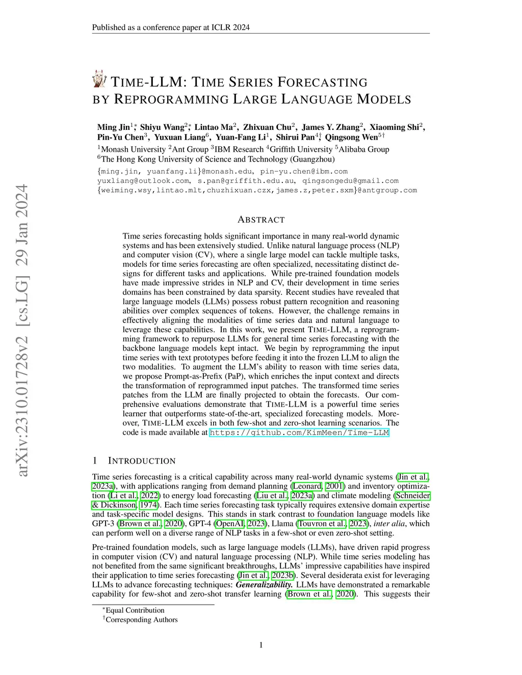 Time-LLM: Time Series Forecasting by Reprogramming Large Language Models