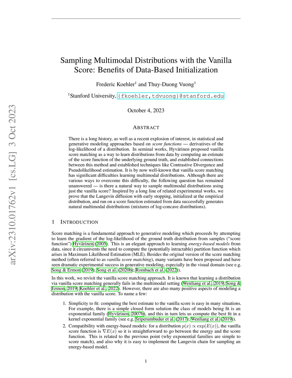 There is a long history, as well as a recent explosion of interest, in statistical and generative modeling approaches based on score functions -- derivatives of the log-likelihood of a distribution. In seminal works, Hyv\"arinen proposed vanilla score matching as a way to learn distributions from data by computing an estimate of the score function of the underlying ground truth, and established connections between this method and established techniques like Contrastive Divergence and Pseudolikelihood estimation. It is by now well-known that vanilla score matching has significant difficulties learning multimodal distributions. Although there are various ways to overcome this difficulty, the following question has remained unanswered -- is there a natural way to sample multimodal distributions using just the vanilla score? Inspired by a long line of related experimental works, we prove that the Langevin diffusion with early stopping, initialized at the empirical distribution, and run on a score function estimated from data successfully generates natural multimodal distributions (mixtures of log-concave distributions).