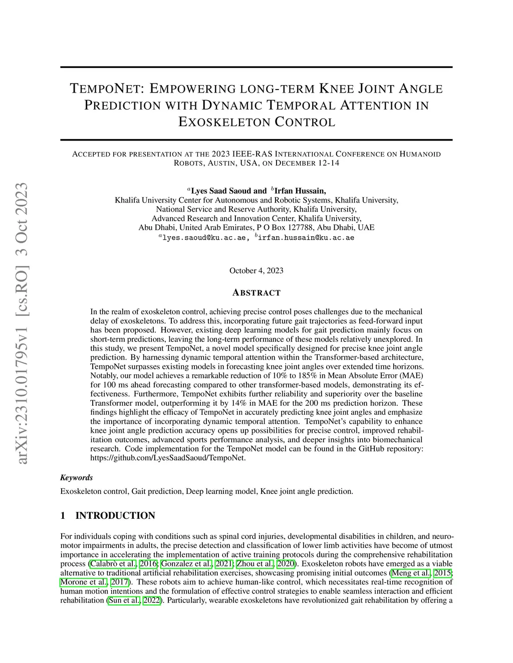 In the realm of exoskeleton control, achieving precise control poses challenges due to the mechanical delay of exoskeletons. To address this, incorporating future gait trajectories as feed-forward input has been proposed. However, existing deep learning models for gait prediction mainly focus on short-term predictions, leaving the long-term performance of these models relatively unexplored. In this study, we present TempoNet, a novel model specifically designed for precise knee joint angle prediction. By harnessing dynamic temporal attention within the Transformer-based architecture, TempoNet surpasses existing models in forecasting knee joint angles over extended time horizons. Notably, our model achieves a remarkable reduction of 10\% to 185\% in Mean Absolute Error (MAE) for 100 ms ahead forecasting compared to other transformer-based models, demonstrating its effectiveness. Furthermore, TempoNet exhibits further reliability and superiority over the baseline Transformer model, outperforming it by 14\% in MAE for the 200 ms prediction horizon. These findings highlight the efficacy of TempoNet in accurately predicting knee joint angles and emphasize the importance of incorporating dynamic temporal attention. TempoNet's capability to enhance knee joint angle prediction accuracy opens up possibilities for precise control, improved rehabilitation outcomes, advanced sports performance analysis, and deeper insights into biomechanical research. Code implementation for the TempoNet model can be found in the GitHub repository: https://github.com/LyesSaadSaoud/TempoNet.
