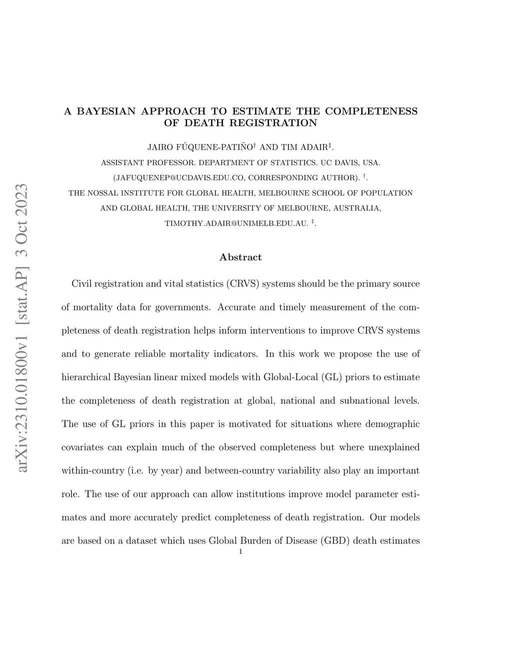 Civil registration and vital statistics (CRVS) systems should be the primary source of mortality data for governments. Accurate and timely measurement of the completeness of death registration helps inform interventions to improve CRVS systems and to generate reliable mortality indicators. In this work we propose the use of hierarchical Bayesian linear mixed models with Global-Local (GL) priors to estimate the completeness of death registration at global, national and subnational levels. The use of GL priors in this paper is motivated for situations where demographic covariates can explain much of the observed completeness but where unexplained within-country (i.e. by year) and between-country variability also play an important role. The use of our approach can allow institutions improve model parameter estimates and more accurately predict completeness of death registration. Our models are based on a dataset which uses Global Burden of Disease (GBD) death estimates based on the GBD 2019 and comprises 120 countries and 2,748 country-years from 1970-2019 (Demographics Collaborators, 2020). To illustrate the effectiveness of our proposal we consider the completeness of death registration in the departments of Colombia in 2017.