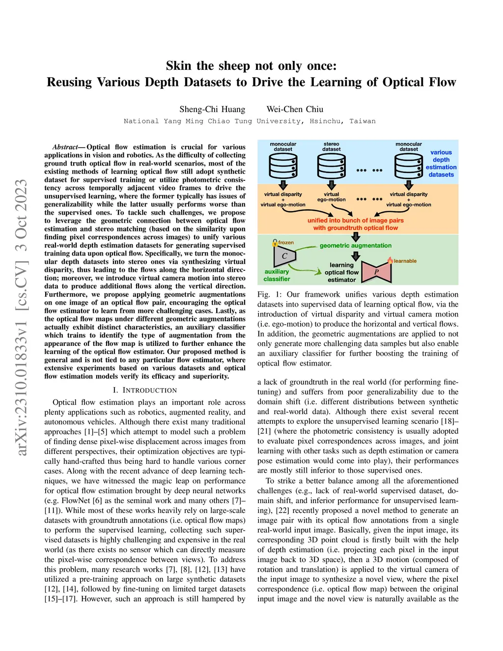 Optical flow estimation is crucial for various applications in vision and robotics. As the difficulty of collecting ground truth optical flow in real-world scenarios, most of the existing methods of learning optical flow still adopt synthetic dataset for supervised training or utilize photometric consistency across temporally adjacent video frames to drive the unsupervised learning, where the former typically has issues of generalizability while the latter usually performs worse than the supervised ones. To tackle such challenges, we propose to leverage the geometric connection between optical flow estimation and stereo matching (based on the similarity upon finding pixel correspondences across images) to unify various real-world depth estimation datasets for generating supervised training data upon optical flow. Specifically, we turn the monocular depth datasets into stereo ones via synthesizing virtual disparity, thus leading to the flows along the horizontal direction; moreover, we introduce virtual camera motion into stereo data to produce additional flows along the vertical direction. Furthermore, we propose applying geometric augmentations on one image of an optical flow pair, encouraging the optical flow estimator to learn from more challenging cases. Lastly, as the optical flow maps under different geometric augmentations actually exhibit distinct characteristics, an auxiliary classifier which trains to identify the type of augmentation from the appearance of the flow map is utilized to further enhance the learning of the optical flow estimator. Our proposed method is general and is not tied to any particular flow estimator, where extensive experiments based on various datasets and optical flow estimation models verify its efficacy and superiority.