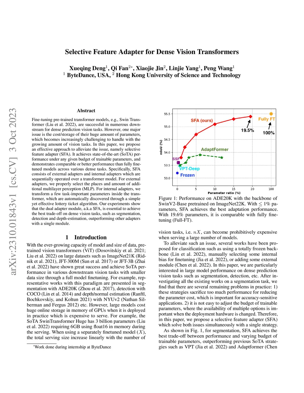 Fine-tuning pre-trained transformer models, e.g., Swin Transformer, are successful in numerous downstream for dense prediction vision tasks. However, one major issue is the cost/storage of their huge amount of parameters, which becomes increasingly challenging to handle with the growing amount of vision tasks. In this paper, we propose an effective approach to alleviate the issue, namely selective feature adapter (SFA). It achieves state-of-the-art (SoTA) performance under any given budget of trainable parameters, and demonstrates comparable or better performance than fully fine-tuned models across various dense tasks. Specifically, SFA consists of external adapters and internal adapters which are sequentially operated over a transformer model. For external adapters, we properly select the places and amount of additional multilayer perception (MLP). For internal adapters, we transform a few task-important parameters inside the transformer, which are automatically discovered through a simple yet effective lottery ticket algorithm. Our experiments show that the dual adapter module, a.k.a SFA, is essential to achieve the best trade-off on dense vision tasks, such as segmentation, detection and depth-estimation, outperforming other adapters with a single module.