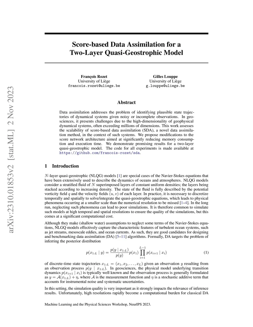 Data assimilation addresses the problem of identifying plausible state trajectories of dynamical systems given noisy or incomplete observations. In geosciences, it presents challenges due to the high-dimensionality of geophysical dynamical systems, often exceeding millions of dimensions. This work assesses the scalability of score-based data assimilation (SDA), a novel data assimilation method, in the context of such systems. We propose modifications to the score network architecture aimed at significantly reducing memory consumption and execution time. We demonstrate promising results for a two-layer quasi-geostrophic model.