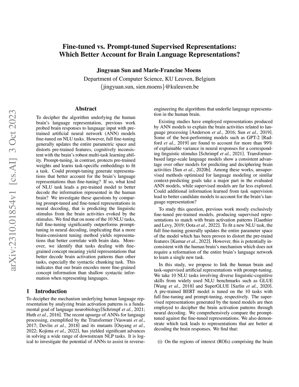 To decipher the algorithm underlying the human brain's language representation, previous work probed brain responses to language input with pre-trained artificial neural network (ANN) models fine-tuned on NLU tasks. However, full fine-tuning generally updates the entire parametric space and distorts pre-trained features, cognitively inconsistent with the brain's robust multi-task learning ability. Prompt-tuning, in contrast, protects pre-trained weights and learns task-specific embeddings to fit a task. Could prompt-tuning generate representations that better account for the brain's language representations than fine-tuning? If so, what kind of NLU task leads a pre-trained model to better decode the information represented in the human brain? We investigate these questions by comparing prompt-tuned and fine-tuned representations in neural decoding, that is predicting the linguistic stimulus from the brain activities evoked by the stimulus. We find that on none of the 10 NLU tasks, full fine-tuning significantly outperforms prompt-tuning in neural decoding, implicating that a more brain-consistent tuning method yields representations that better correlate with brain data. Moreover, we identify that tasks dealing with fine-grained concept meaning yield representations that better decode brain activation patterns than other tasks, especially the syntactic chunking task. This indicates that our brain encodes more fine-grained concept information than shallow syntactic information when representing languages.