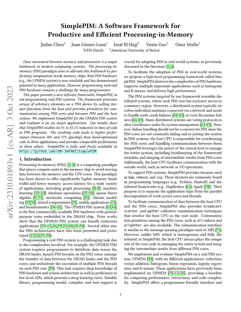 Data movement between memory and processors is a major bottleneck in modern computing systems. The processing-in-memory (PIM) paradigm aims to alleviate this bottleneck by performing computation inside memory chips. Real PIM hardware (e.g., the UPMEM system) is now available and has demonstrated potential in many applications. However, programming such real PIM hardware remains a challenge for many programmers. This paper presents a new software framework, SimplePIM, to aid programming real PIM systems. The framework processes arrays of arbitrary elements on a PIM device by calling iterator functions from the host and provides primitives for communication among PIM cores and between PIM and the host system. We implement SimplePIM for the UPMEM PIM system and evaluate it on six major applications. Our results show that SimplePIM enables 66.5% to 83.1% reduction in lines of code in PIM programs. The resulting code leads to higher performance (between 10% and 37% speedup) than hand-optimized code in three applications and provides comparable performance in three others. SimplePIM is fully and freely available at https://github.com/CMU-SAFARI/SimplePIM.