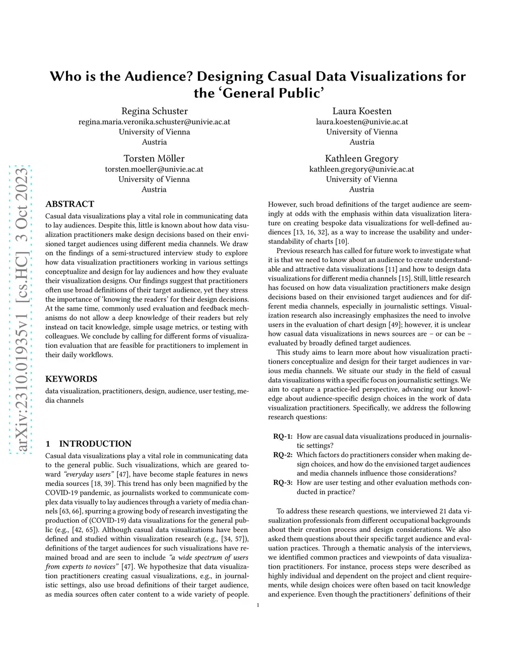Casual data visualizations play a vital role in communicating data to lay audiences. Despite this, little is known about how data visualization practitioners make design decisions based on their envisioned target audiences using different media channels. We draw on the findings of a semi-structured interview study to explore how data visualization practitioners working in various settings conceptualize and design for lay audiences and how they evaluate their visualization designs. Our findings suggest that practitioners often use broad definitions of their target audience, yet they stress the importance of 'knowing the readers' for their design decisions. At the same time, commonly used evaluation and feedback mechanisms do not allow a deep knowledge of their readers but rely instead on tacit knowledge, simple usage metrics, or testing with colleagues. We conclude by calling for different forms of visualization evaluation that are feasible for practitioners to implement in their daily workflows.