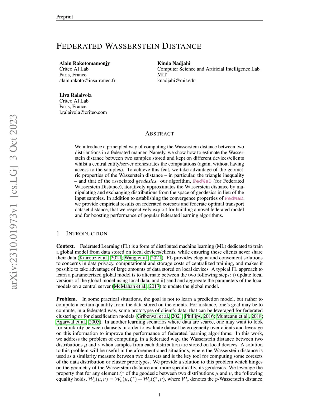 We introduce a principled way of computing the Wasserstein distance between two distributions in a federated manner. Namely, we show how to estimate the Wasserstein distance between two samples stored and kept on different devices/clients whilst a central entity/server orchestrates the computations (again, without having access to the samples). To achieve this feat, we take advantage of the geometric properties of the Wasserstein distance -- in particular, the triangle inequality -- and that of the associated {\em geodesics}: our algorithm, FedWad (for Federated Wasserstein Distance), iteratively approximates the Wasserstein distance by manipulating and exchanging distributions from the space of geodesics in lieu of the input samples. In addition to establishing the convergence properties of FedWad, we provide empirical results on federated coresets and federate optimal transport dataset distance, that we respectively exploit for building a novel federated model and for boosting performance of popular federated learning algorithms.