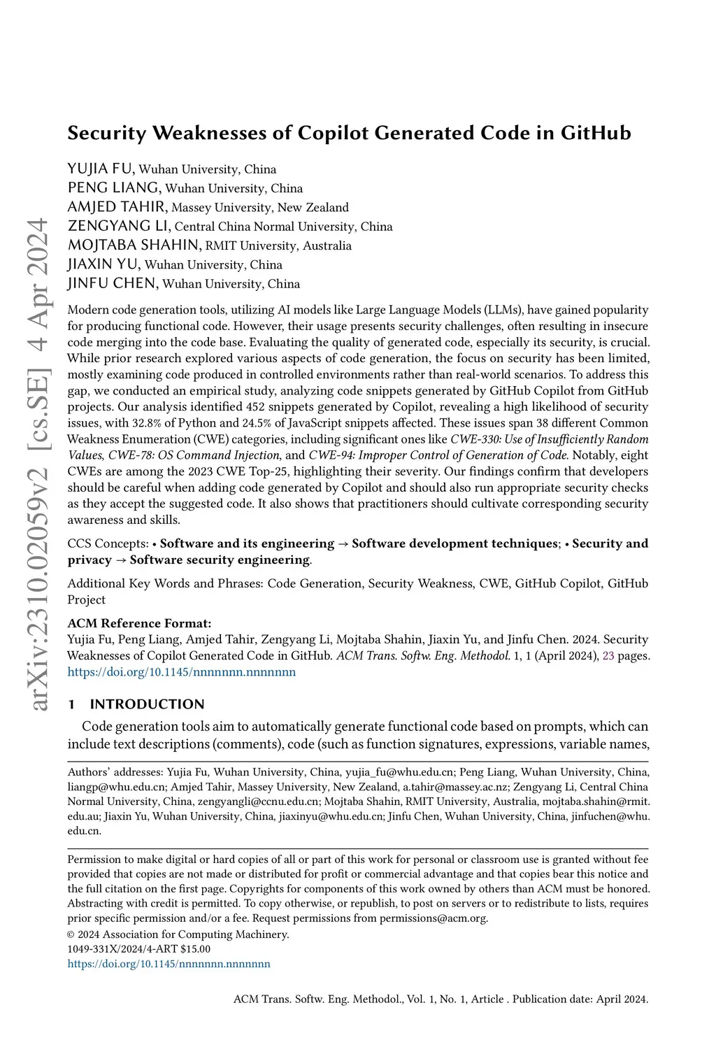 Security Weaknesses of Copilot-Generated Code in GitHub Projects: An Empirical Study