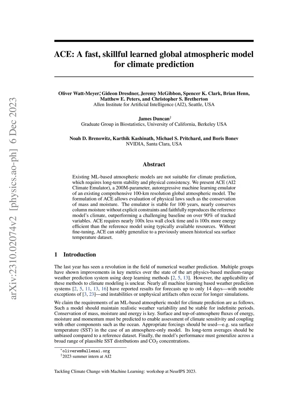 Existing ML-based atmospheric models are not suitable for climate prediction, which requires long-term stability and physical consistency. We present ACE (AI2 Climate Emulator), a 200M-parameter, autoregressive machine learning emulator of an existing comprehensive 100-km resolution global atmospheric model. The formulation of ACE allows evaluation of physical laws such as the conservation of mass and moisture. The emulator is stable for 100 years, nearly conserves column moisture without explicit constraints and faithfully reproduces the reference model's climate, outperforming a challenging baseline on over 90% of tracked variables. ACE requires nearly 100x less wall clock time and is 100x more energy efficient than the reference model using typically available resources. Without fine-tuning, ACE can stably generalize to a previously unseen historical sea surface temperature dataset.