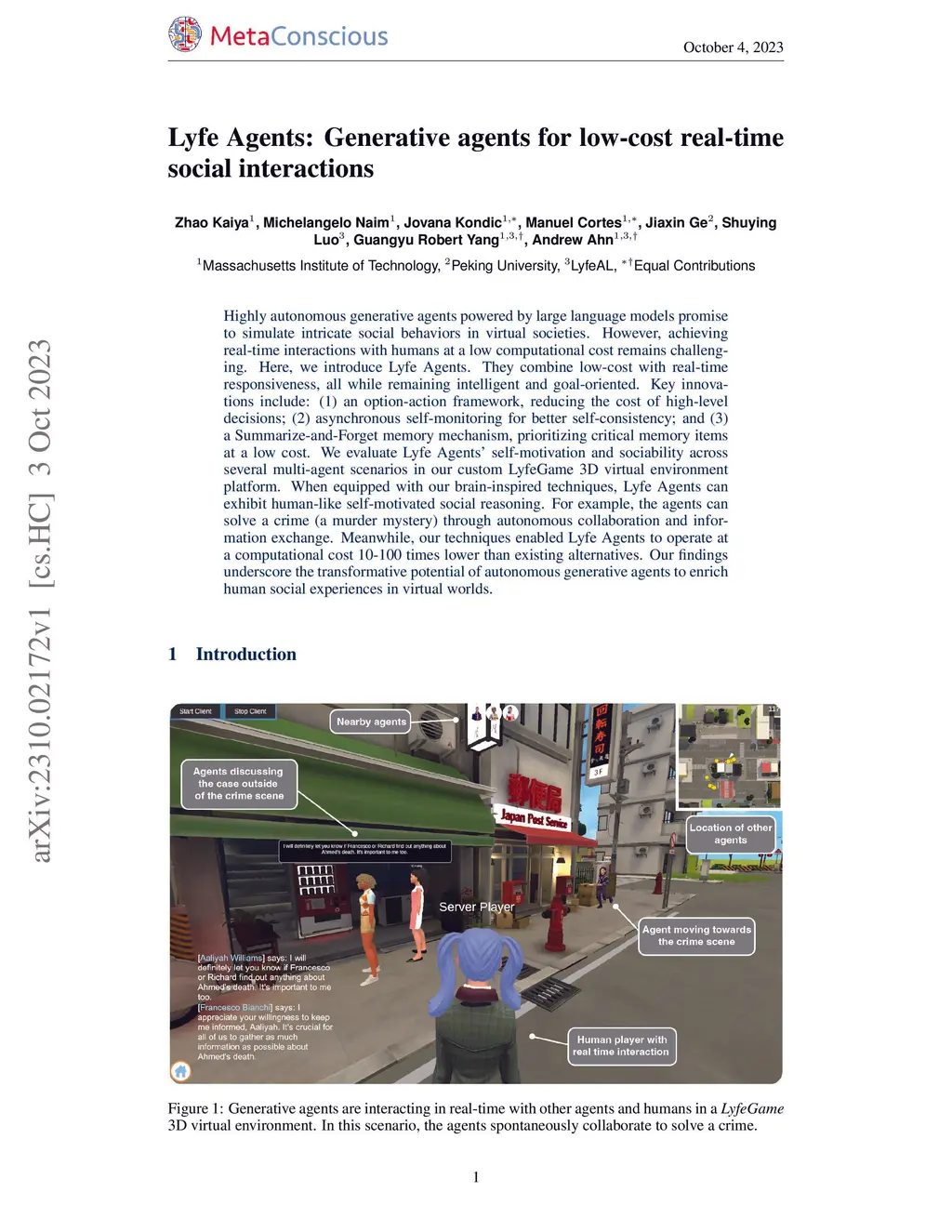 Highly autonomous generative agents powered by large language models promise to simulate intricate social behaviors in virtual societies. However, achieving real-time interactions with humans at a low computational cost remains challenging. Here, we introduce Lyfe Agents. They combine low-cost with real-time responsiveness, all while remaining intelligent and goal-oriented. Key innovations include: (1) an option-action framework, reducing the cost of high-level decisions; (2) asynchronous self-monitoring for better self-consistency; and (3) a Summarize-and-Forget memory mechanism, prioritizing critical memory items at a low cost. We evaluate Lyfe Agents' self-motivation and sociability across several multi-agent scenarios in our custom LyfeGame 3D virtual environment platform. When equipped with our brain-inspired techniques, Lyfe Agents can exhibit human-like self-motivated social reasoning. For example, the agents can solve a crime (a murder mystery) through autonomous collaboration and information exchange. Meanwhile, our techniques enabled Lyfe Agents to operate at a computational cost 10-100 times lower than existing alternatives. Our findings underscore the transformative potential of autonomous generative agents to enrich human social experiences in virtual worlds.