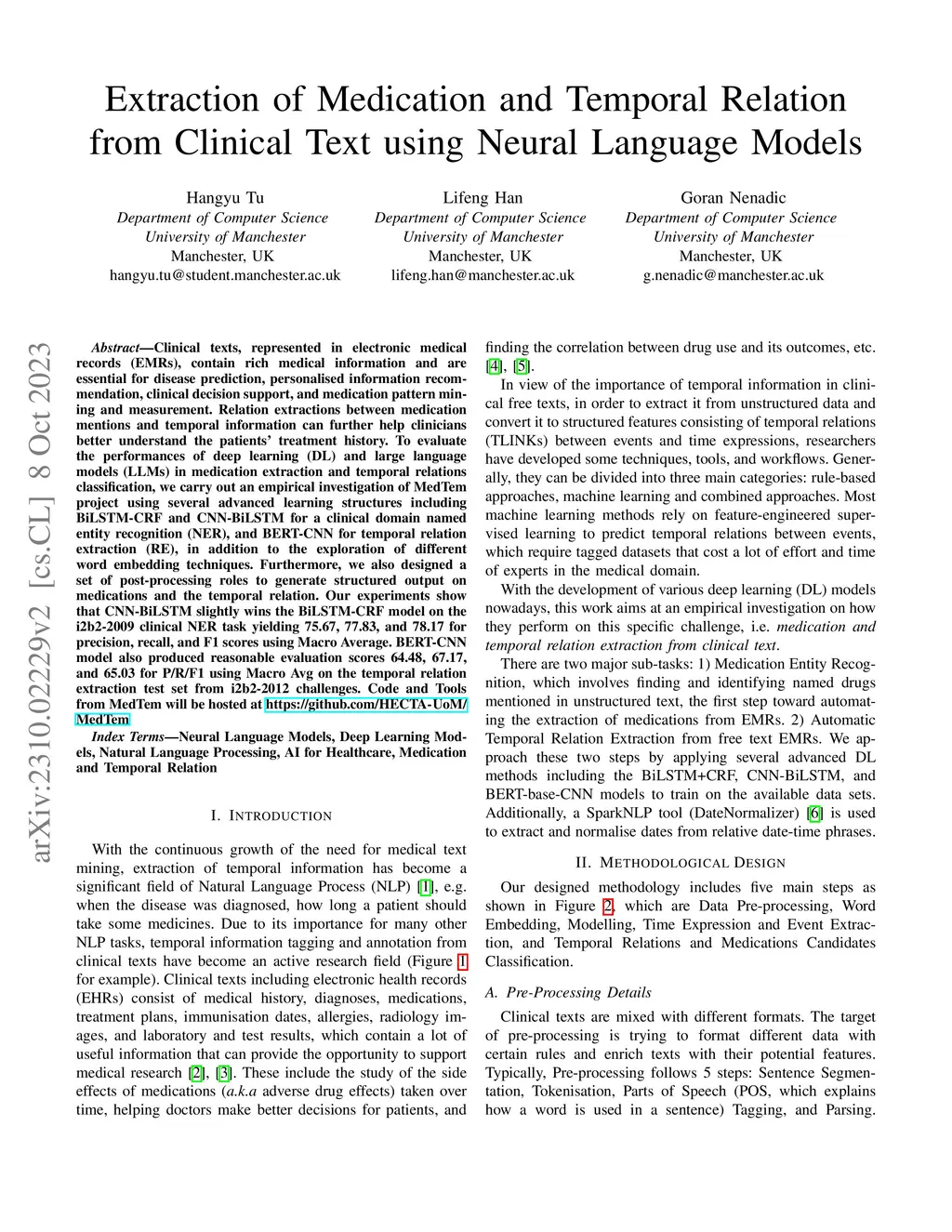 Clinical texts, represented in electronic medical records (EMRs), contain rich medical information and are essential for disease prediction, personalised information recommendation, clinical decision support, and medication pattern mining and measurement. Relation extractions between medication mentions and temporal information can further help clinicians better understand the patients' treatment history. To evaluate the performances of deep learning (DL) and large language models (LLMs) in medication extraction and temporal relations classification, we carry out an empirical investigation of \textbf{MedTem} project using several advanced learning structures including BiLSTM-CRF and CNN-BiLSTM for a clinical domain named entity recognition (NER), and BERT-CNN for temporal relation extraction (RE), in addition to the exploration of different word embedding techniques. Furthermore, we also designed a set of post-processing roles to generate structured output on medications and the temporal relation. Our experiments show that CNN-BiLSTM slightly wins the BiLSTM-CRF model on the i2b2-2009 clinical NER task yielding 75.67, 77.83, and 78.17 for precision, recall, and F1 scores using Macro Average. BERT-CNN model also produced reasonable evaluation scores 64.48, 67.17, and 65.03 for P/R/F1 using Macro Avg on the temporal relation extraction test set from i2b2-2012 challenges. Code and Tools from MedTem will be hosted at \url{https://github.com/HECTA-UoM/MedTem}