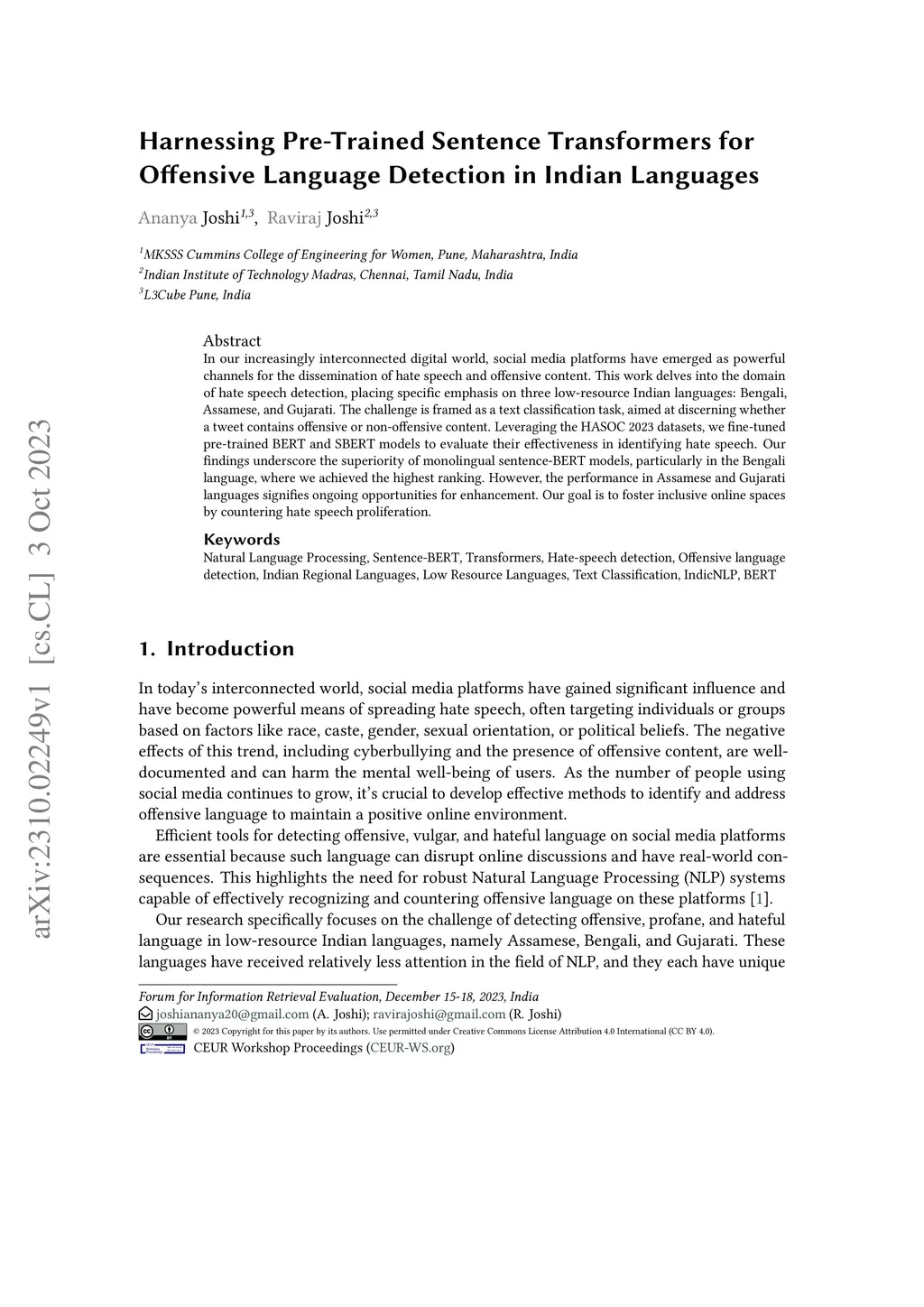 In our increasingly interconnected digital world, social media platforms have emerged as powerful channels for the dissemination of hate speech and offensive content. This work delves into the domain of hate speech detection, placing specific emphasis on three low-resource Indian languages: Bengali, Assamese, and Gujarati. The challenge is framed as a text classification task, aimed at discerning whether a tweet contains offensive or non-offensive content. Leveraging the HASOC 2023 datasets, we fine-tuned pre-trained BERT and SBERT models to evaluate their effectiveness in identifying hate speech. Our findings underscore the superiority of monolingual sentence-BERT models, particularly in the Bengali language, where we achieved the highest ranking. However, the performance in Assamese and Gujarati languages signifies ongoing opportunities for enhancement. Our goal is to foster inclusive online spaces by countering hate speech proliferation.