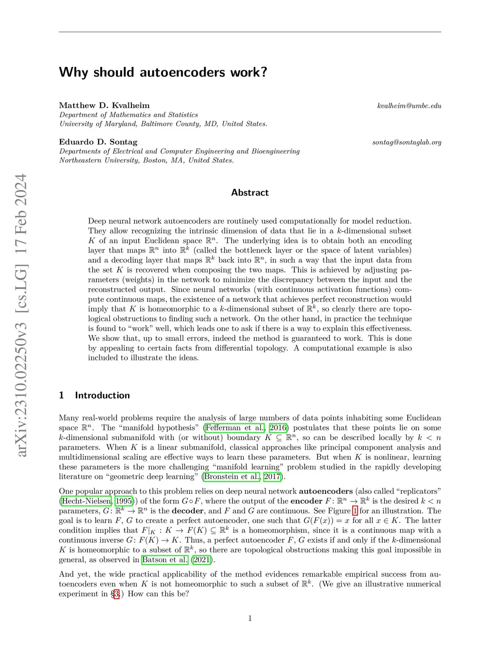 Deep neural network autoencoders are routinely used computationally for model reduction. They allow recognizing the intrinsic dimension of data that lie in a -dimensional subset of an input Euclidean space . The underlying idea is to obtain both an encoding layer that maps into (called the bottleneck layer or the space of latent variables) and a decoding layer that maps back into , in such a way that the input data from the set is recovered when composing the two maps. This is achieved by adjusting parameters (weights) in the network to minimize the discrepancy between the input and the reconstructed output. Since neural networks (with continuous activation functions) compute continuous maps, the existence of a network that achieves perfect reconstruction would imply that is homeomorphic to a -dimensional subset of , so clearly there are topological obstructions to finding such a network. On the other hand, in practice the technique is found to "work" well, which leads one to ask if there is a way to explain this effectiveness. We show that, up to small errors, indeed the method is guaranteed to work. This is done by appealing to certain facts from differential topology. A computational example is also included to illustrate the ideas.