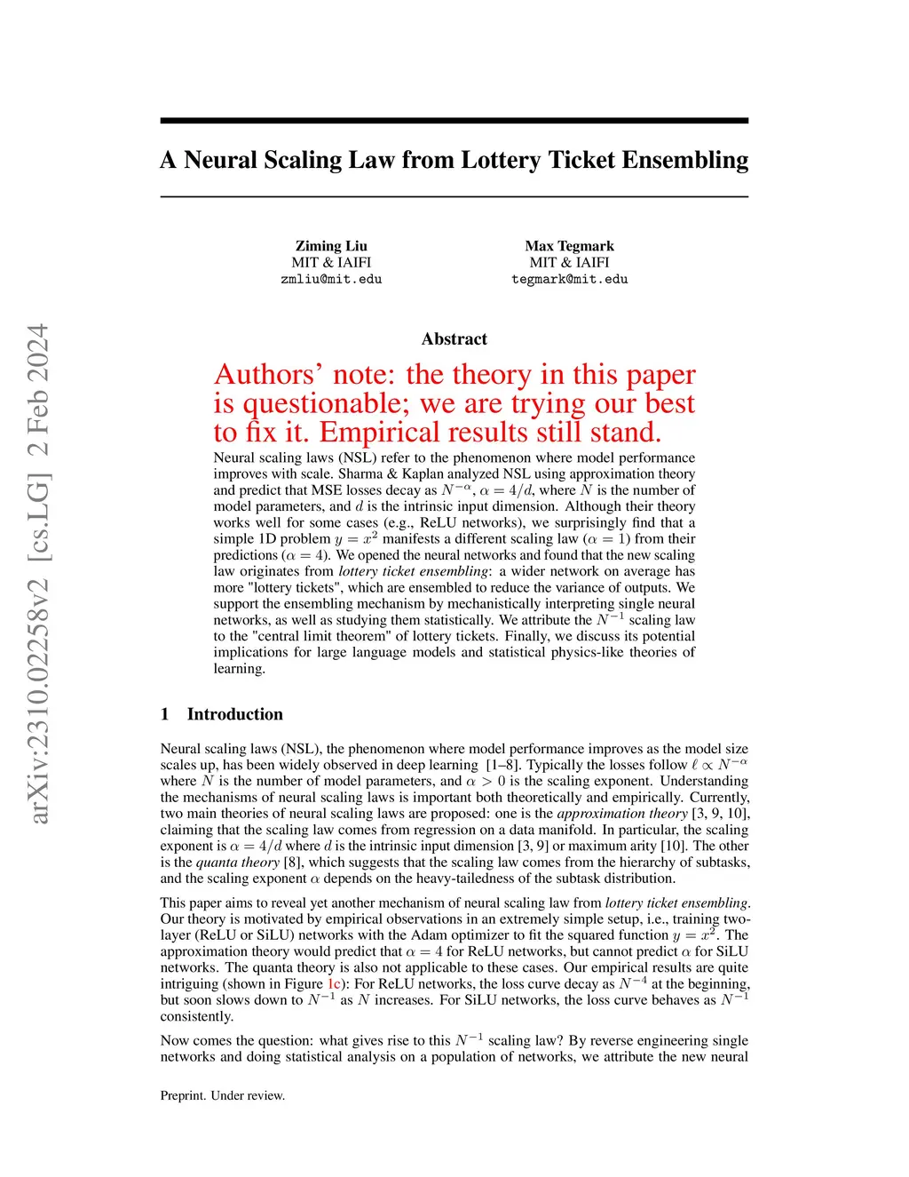 Neural scaling laws (NSL) refer to the phenomenon where model performance improves with scale. Sharma & Kaplan analyzed NSL using approximation theory and predict that MSE losses decay as , , where is the number of model parameters, and is the intrinsic input dimension. Although their theory works well for some cases (e.g., ReLU networks), we surprisingly find that a simple 1D problem manifests a different scaling law () from their predictions (). We opened the neural networks and found that the new scaling law originates from lottery ticket ensembling: a wider network on average has more "lottery tickets", which are ensembled to reduce the variance of outputs. We support the ensembling mechanism by mechanistically interpreting single neural networks, as well as studying them statistically. We attribute the scaling law to the "central limit theorem" of lottery tickets. Finally, we discuss its potential implications for large language models and statistical physics-type theories of learning.