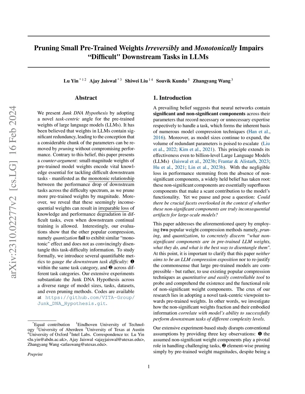 Junk DNA Hypothesis: Pruning Small Pre-Trained Weights Irreversibly and Monotonically Impairs "Difficult" Downstream Tasks in LLMs