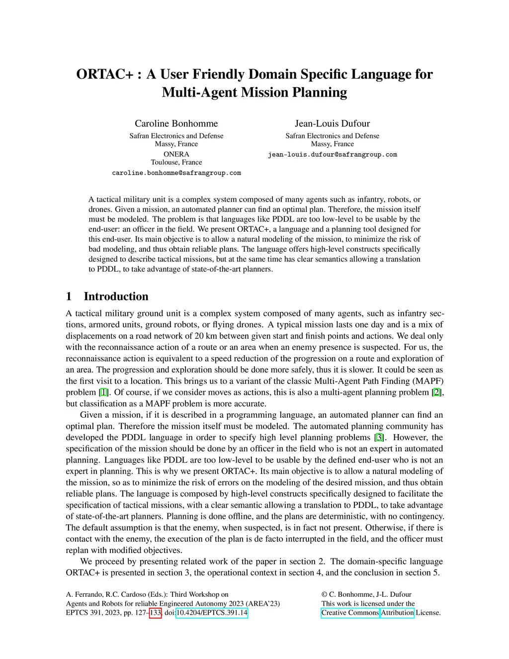 A tactical military unit is a complex system composed of many agents such as infantry, robots, or drones. Given a mission, an automated planner can find an optimal plan. Therefore, the mission itself must be modeled. The problem is that languages like PDDL are too low-level to be usable by the end-user: an officer in the field. We present ORTAC+, a language and a planning tool designed for this end-user. Its main objective is to allow a natural modeling of the mission, to minimize the risk of bad modeling, and thus obtain reliable plans. The language offers high-level constructs specifically designed to describe tactical missions, but at the same time has clear semantics allowing a translation to PDDL, to take advantage of state-of-the-art planners.