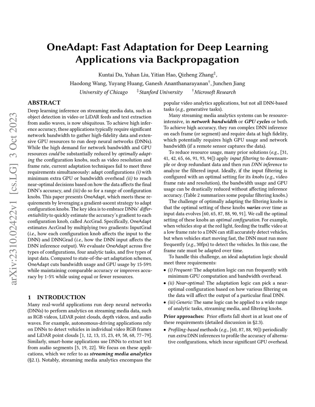 Deep learning inference on streaming media data, such as object detection in video or LiDAR feeds and text extraction from audio waves, is now ubiquitous. To achieve high inference accuracy, these applications typically require significant network bandwidth to gather high-fidelity data and extensive GPU resources to run deep neural networks (DNNs). While the high demand for network bandwidth and GPU resources could be substantially reduced by optimally adapting the configuration knobs, such as video resolution and frame rate, current adaptation techniques fail to meet three requirements simultaneously: adapt configurations (i) with minimum extra GPU or bandwidth overhead; (ii) to reach near-optimal decisions based on how the data affects the final DNN's accuracy, and (iii) do so for a range of configuration knobs. This paper presents OneAdapt, which meets these requirements by leveraging a gradient-ascent strategy to adapt configuration knobs. The key idea is to embrace DNNs' differentiability to quickly estimate the accuracy's gradient to each configuration knob, called AccGrad. Specifically, OneAdapt estimates AccGrad by multiplying two gradients: InputGrad (i.e. how each configuration knob affects the input to the DNN) and DNNGrad (i.e. how the DNN input affects the DNN inference output). We evaluate OneAdapt across five types of configurations, four analytic tasks, and five types of input data. Compared to state-of-the-art adaptation schemes, OneAdapt cuts bandwidth usage and GPU usage by 15-59% while maintaining comparable accuracy or improves accuracy by 1-5% while using equal or fewer resources.