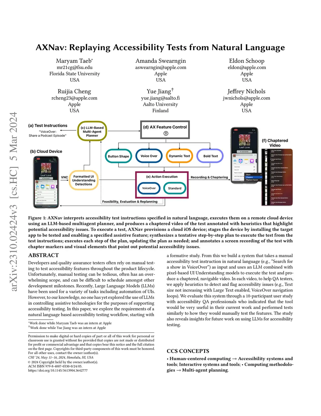 Developers and quality assurance testers often rely on manual testing to test accessibility features throughout the product lifecycle. Unfortunately, manual testing can be tedious, often has an overwhelming scope, and can be difficult to schedule amongst other development milestones. Recently, Large Language Models (LLMs) have been used for a variety of tasks including automation of UIs, however to our knowledge no one has yet explored their use in controlling assistive technologies for the purposes of supporting accessibility testing. In this paper, we explore the requirements of a natural language based accessibility testing workflow, starting with a formative study. From this we build a system that takes as input a manual accessibility test (e.g., ``Search for a show in VoiceOver'') and uses an LLM combined with pixel-based UI Understanding models to execute the test and produce a chaptered, navigable video. In each video, to help QA testers we apply heuristics to detect and flag accessibility issues (e.g., Text size not increasing with Large Text enabled, VoiceOver navigation loops). We evaluate this system through a 10 participant user study with accessibility QA professionals who indicated that the tool would be very useful in their current work and performed tests similarly to how they would manually test the features. The study also reveals insights for future work on using LLMs for accessibility testing.