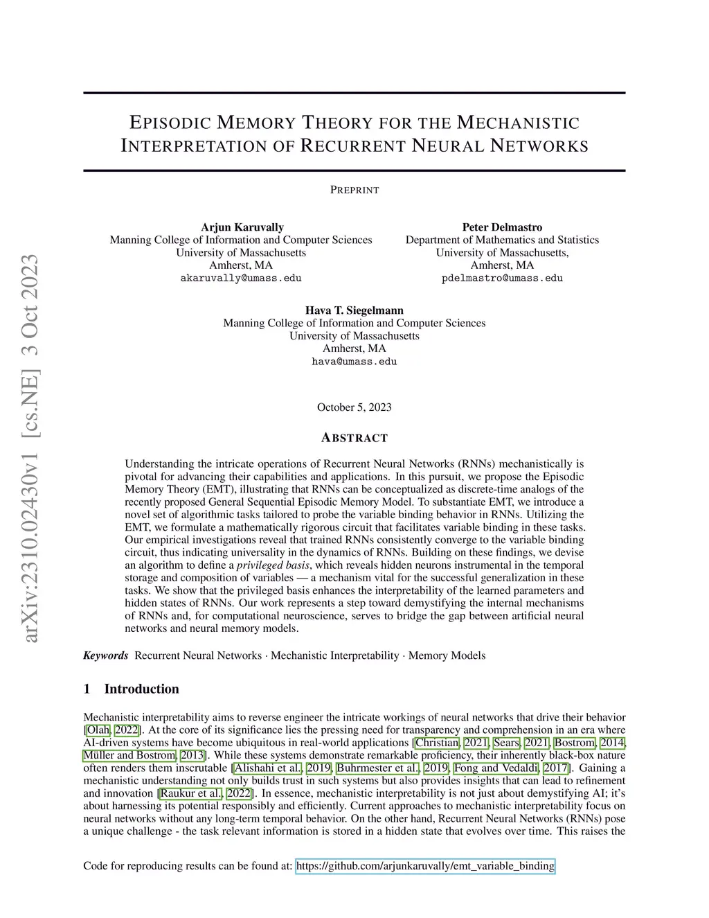 Understanding the intricate operations of Recurrent Neural Networks (RNNs) mechanistically is pivotal for advancing their capabilities and applications. In this pursuit, we propose the Episodic Memory Theory (EMT), illustrating that RNNs can be conceptualized as discrete-time analogs of the recently proposed General Sequential Episodic Memory Model. To substantiate EMT, we introduce a novel set of algorithmic tasks tailored to probe the variable binding behavior in RNNs. Utilizing the EMT, we formulate a mathematically rigorous circuit that facilitates variable binding in these tasks. Our empirical investigations reveal that trained RNNs consistently converge to the variable binding circuit, thus indicating universality in the dynamics of RNNs. Building on these findings, we devise an algorithm to define a privileged basis, which reveals hidden neurons instrumental in the temporal storage and composition of variables, a mechanism vital for the successful generalization in these tasks. We show that the privileged basis enhances the interpretability of the learned parameters and hidden states of RNNs. Our work represents a step toward demystifying the internal mechanisms of RNNs and, for computational neuroscience, serves to bridge the gap between artificial neural networks and neural memory models.