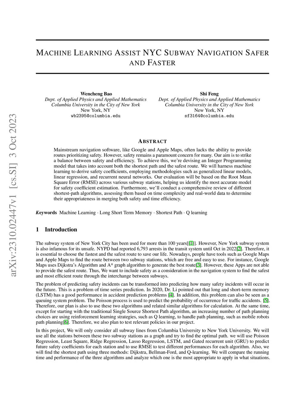 Mainstream navigation software, like Google and Apple Maps, often lacks the ability to provide routes prioritizing safety. However, safety remains a paramount concern for many. Our aim is to strike a balance between safety and efficiency. To achieve this, we're devising an Integer Programming model that takes into account both the shortest path and the safest route. We will harness machine learning to derive safety coefficients, employing methodologies such as generalized linear models, linear regression, and recurrent neural networks. Our evaluation will be based on the Root Mean Square Error (RMSE) across various subway stations, helping us identify the most accurate model for safety coefficient estimation. Furthermore, we'll conduct a comprehensive review of different shortest-path algorithms, assessing them based on time complexity and real-world data to determine their appropriateness in merging both safety and time efficiency.