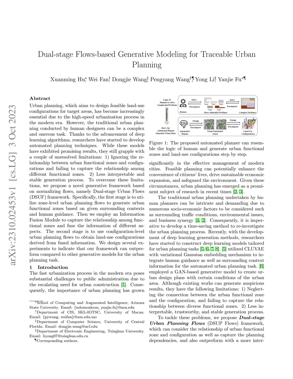 Urban planning, which aims to design feasible land-use configurations for target areas, has become increasingly essential due to the high-speed urbanization process in the modern era. However, the traditional urban planning conducted by human designers can be a complex and onerous task. Thanks to the advancement of deep learning algorithms, researchers have started to develop automated planning techniques. While these models have exhibited promising results, they still grapple with a couple of unresolved limitations: 1) Ignoring the relationship between urban functional zones and configurations and failing to capture the relationship among different functional zones. 2) Less interpretable and stable generation process. To overcome these limitations, we propose a novel generative framework based on normalizing flows, namely Dual-stage Urban Flows (DSUF) framework. Specifically, the first stage is to utilize zone-level urban planning flows to generate urban functional zones based on given surrounding contexts and human guidance. Then we employ an Information Fusion Module to capture the relationship among functional zones and fuse the information of different aspects. The second stage is to use configuration-level urban planning flows to obtain land-use configurations derived from fused information. We design several experiments to indicate that our framework can outperform compared to other generative models for the urban planning task.