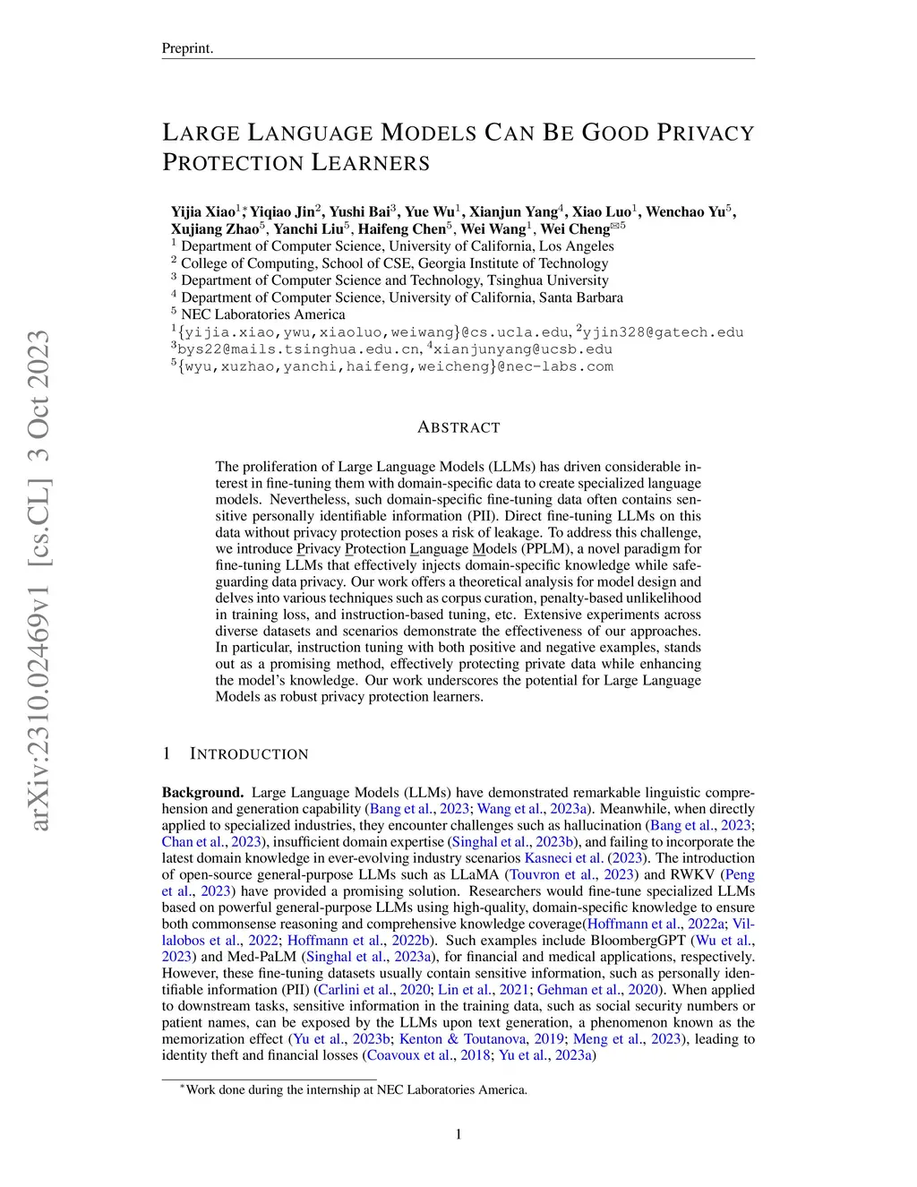 The proliferation of Large Language Models (LLMs) has driven considerable interest in fine-tuning them with domain-specific data to create specialized language models. Nevertheless, such domain-specific fine-tuning data often contains sensitive personally identifiable information (PII). Direct fine-tuning LLMs on this data without privacy protection poses a risk of leakage. To address this challenge, we introduce Privacy Protection Language Models (PPLM), a novel paradigm for fine-tuning LLMs that effectively injects domain-specific knowledge while safeguarding data privacy. Our work offers a theoretical analysis for model design and delves into various techniques such as corpus curation, penalty-based unlikelihood in training loss, and instruction-based tuning, etc. Extensive experiments across diverse datasets and scenarios demonstrate the effectiveness of our approaches. In particular, instruction tuning with both positive and negative examples, stands out as a promising method, effectively protecting private data while enhancing the model's knowledge. Our work underscores the potential for Large Language Models as robust privacy protection learners.