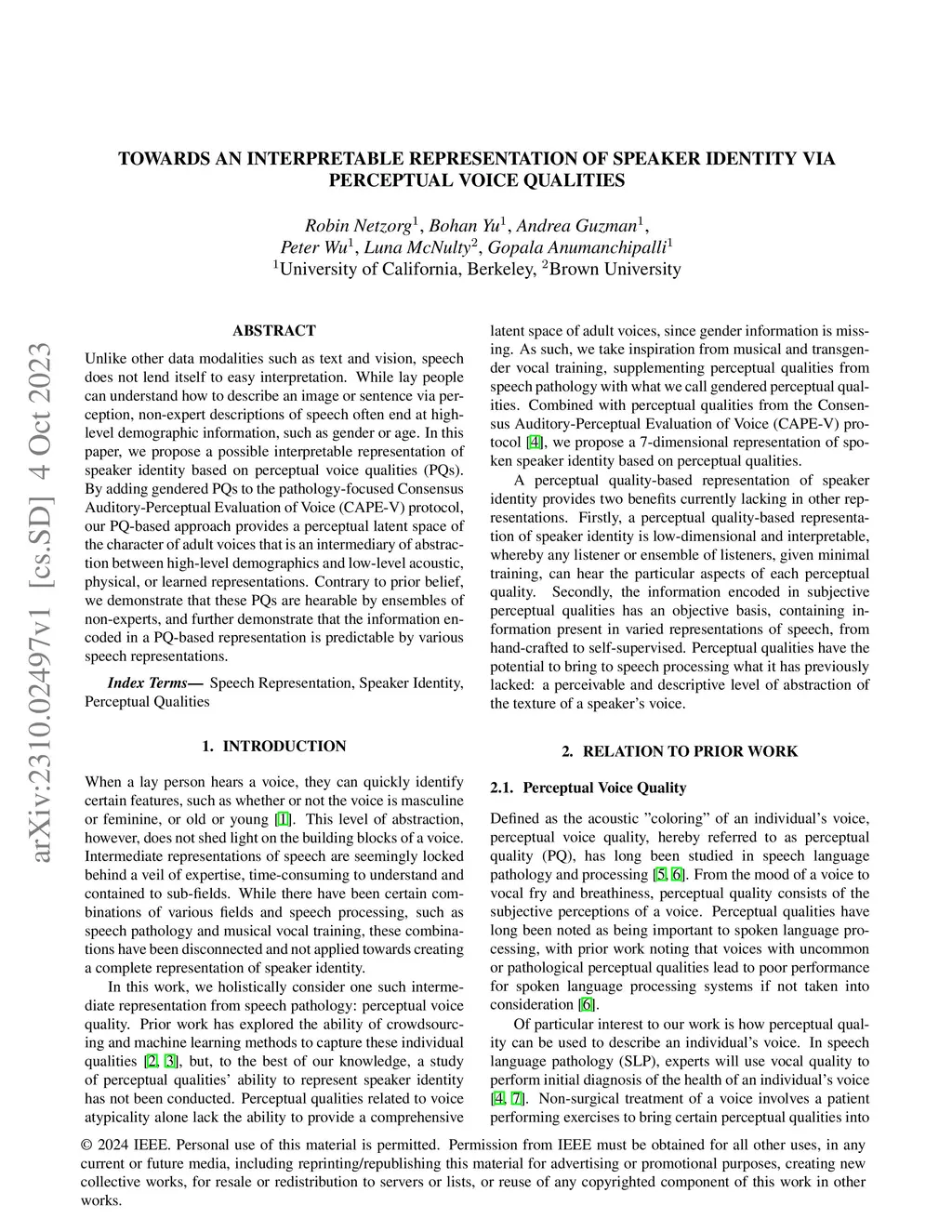 Unlike other data modalities such as text and vision, speech does not lend itself to easy interpretation. While lay people can understand how to describe an image or sentence via perception, non-expert descriptions of speech often end at high-level demographic information, such as gender or age. In this paper, we propose a possible interpretable representation of speaker identity based on perceptual voice qualities (PQs). By adding gendered PQs to the pathology-focused Consensus Auditory-Perceptual Evaluation of Voice (CAPE-V) protocol, our PQ-based approach provides a perceptual latent space of the character of adult voices that is an intermediary of abstraction between high-level demographics and low-level acoustic, physical, or learned representations. Contrary to prior belief, we demonstrate that these PQs are hearable by ensembles of non-experts, and further demonstrate that the information encoded in a PQ-based representation is predictable by various speech representations.