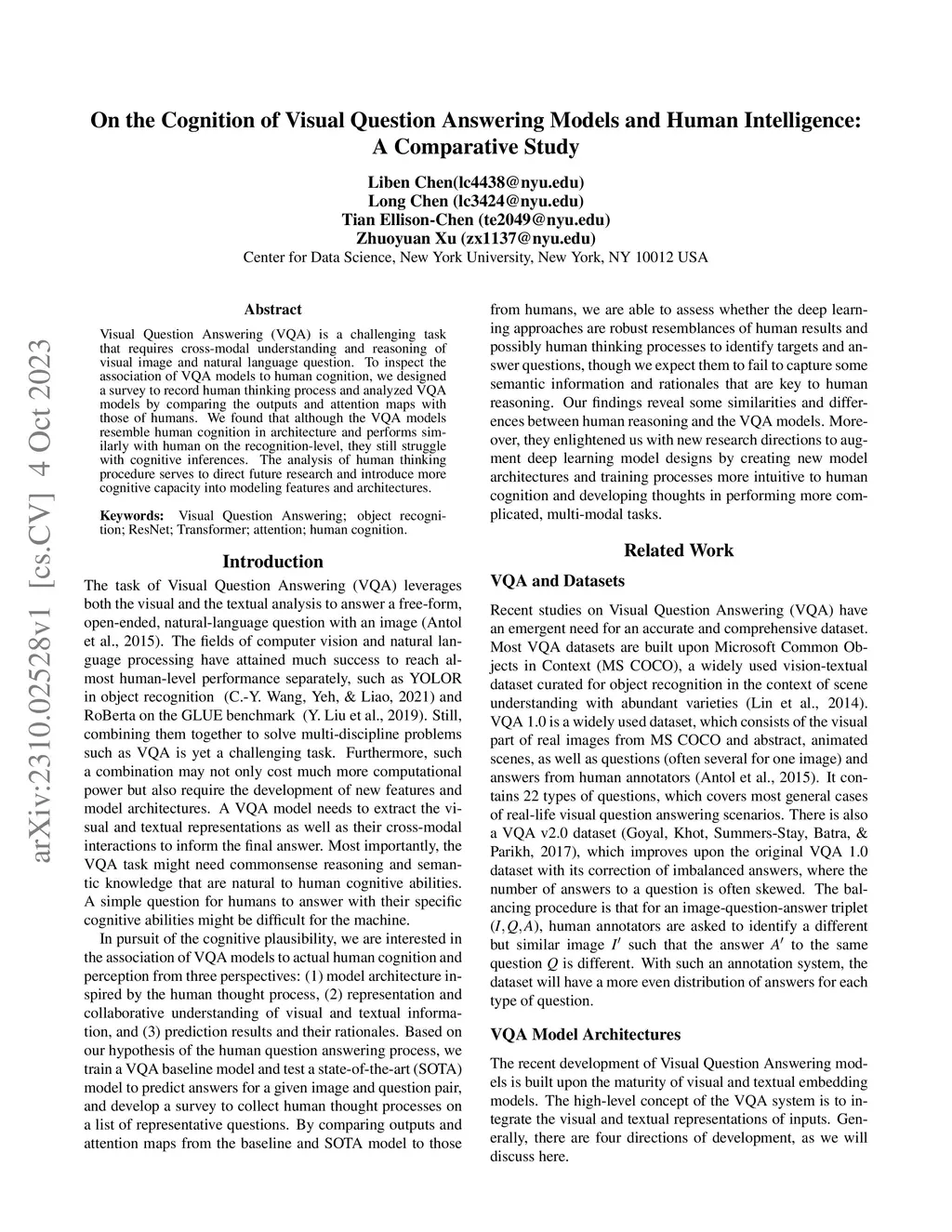 Visual Question Answering (VQA) is a challenging task that requires cross-modal understanding and reasoning of visual image and natural language question. To inspect the association of VQA models to human cognition, we designed a survey to record human thinking process and analyzed VQA models by comparing the outputs and attention maps with those of humans. We found that although the VQA models resemble human cognition in architecture and performs similarly with human on the recognition-level, they still struggle with cognitive inferences. The analysis of human thinking procedure serves to direct future research and introduce more cognitive capacity into modeling features and architectures.