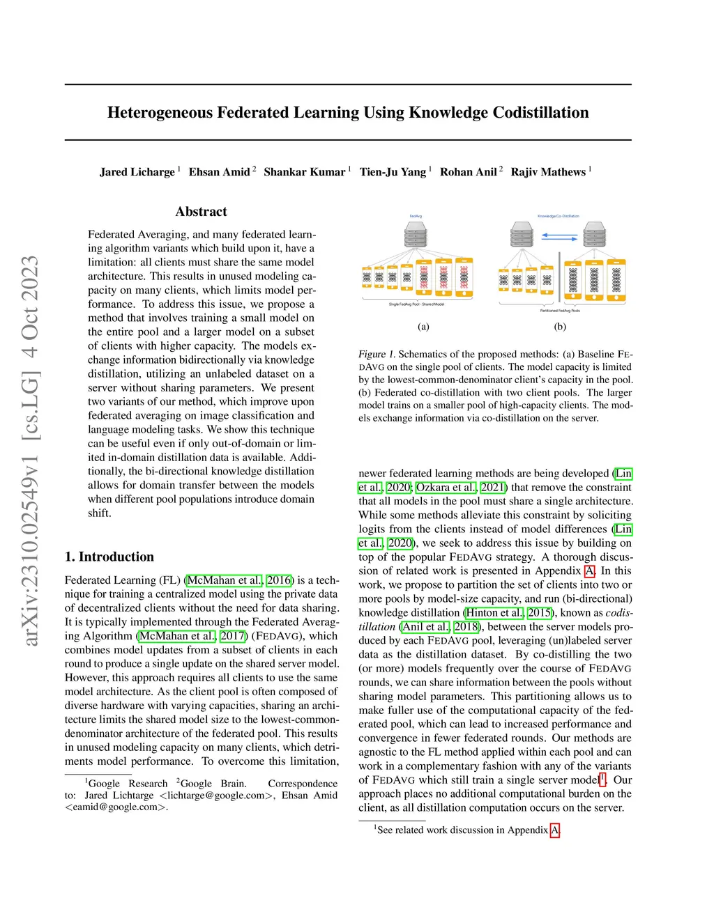 Federated Averaging, and many federated learning algorithm variants which build upon it, have a limitation: all clients must share the same model architecture. This results in unused modeling capacity on many clients, which limits model performance. To address this issue, we propose a method that involves training a small model on the entire pool and a larger model on a subset of clients with higher capacity. The models exchange information bidirectionally via knowledge distillation, utilizing an unlabeled dataset on a server without sharing parameters. We present two variants of our method, which improve upon federated averaging on image classification and language modeling tasks. We show this technique can be useful even if only out-of-domain or limited in-domain distillation data is available. Additionally, the bi-directional knowledge distillation allows for domain transfer between the models when different pool populations introduce domain shift.