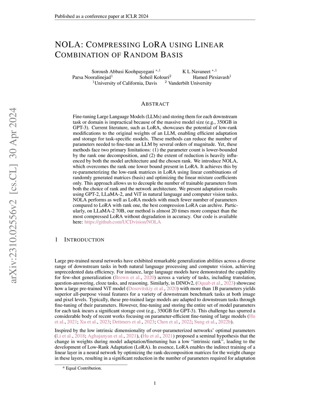 Fine-tuning Large Language Models (LLMs) and storing them for each downstream task or domain is impractical because of the massive model size (e.g., 350GB in GPT-3). Current literature, such as LoRA, showcases the potential of low-rank modifications to the original weights of an LLM, enabling efficient adaptation and storage for task-specific models. These methods can reduce the number of parameters needed to fine-tune an LLM by several orders of magnitude. Yet, these methods face two primary limitations: (1) the parameter count is lower-bounded by the rank one decomposition, and (2) the extent of reduction is heavily influenced by both the model architecture and the chosen rank. We introduce NOLA, which overcomes the rank one lower bound present in LoRA. It achieves this by re-parameterizing the low-rank matrices in LoRA using linear combinations of randomly generated matrices (basis) and optimizing the linear mixture coefficients only. This approach allows us to decouple the number of trainable parameters from both the choice of rank and the network architecture. We present adaptation results using GPT-2, LLaMA-2, and ViT in natural language and computer vision tasks. NOLA performs as well as LoRA models with much fewer number of parameters compared to LoRA with rank one, the best compression LoRA can archive. Particularly, on LLaMA-2 70B, our method is almost 20 times more compact than the most compressed LoRA without degradation in accuracy. Our code is available here: https://github.com/UCDvision/NOLA