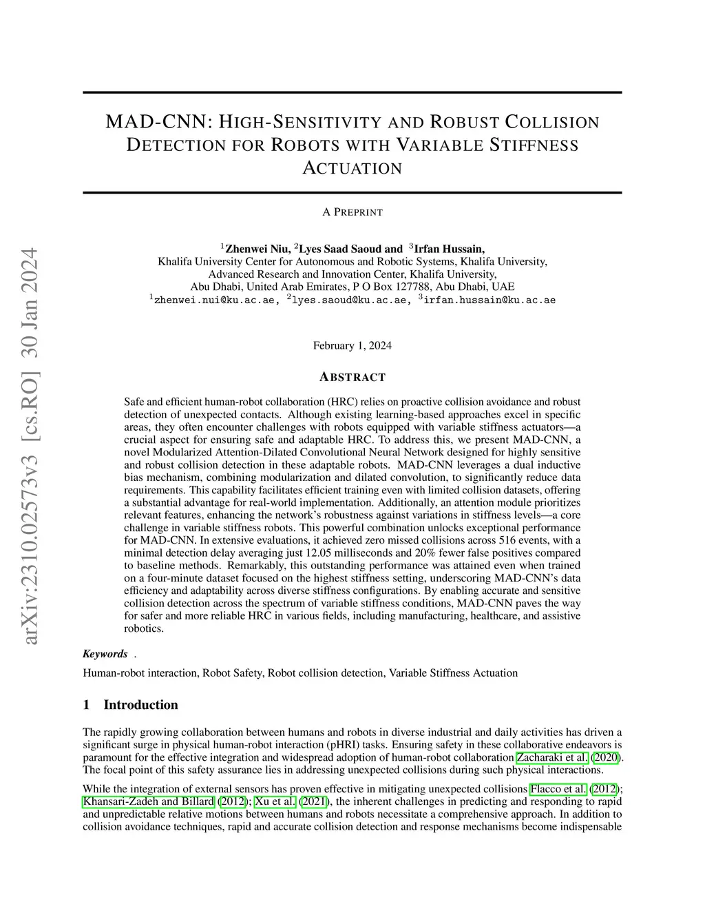 Ensuring safety is paramount in the field of collaborative robotics to mitigate the risks of human injury and environmental damage. Apart from collision avoidance, it is crucial for robots to rapidly detect and respond to unexpected collisions. While several learning-based collision detection methods have been introduced as alternatives to purely model-based detection techniques, there is currently a lack of such methods designed for collaborative robots equipped with variable stiffness actuators. Moreover, there is potential for further enhancing the network's robustness and improving the efficiency of data training. In this paper, we propose a new network, the Modularized Attention-Dilated Convolutional Neural Network (MAD-CNN), for collision detection in robots equipped with variable stiffness actuators. Our model incorporates a dual inductive bias mechanism and an attention module to enhance data efficiency and improve robustness. In particular, MAD-CNN is trained using only a four-minute collision dataset focusing on the highest level of joint stiffness. Despite limited training data, MAD-CNN robustly detects all collisions with minimal detection delay across various stiffness conditions. Moreover, it exhibits a higher level of collision sensitivity, which is beneficial for effectively handling false positives, which is a common issue in learning-based methods. Experimental results demonstrate that the proposed MAD-CNN model outperforms existing state-of-the-art models in terms of collision sensitivity and robustness.