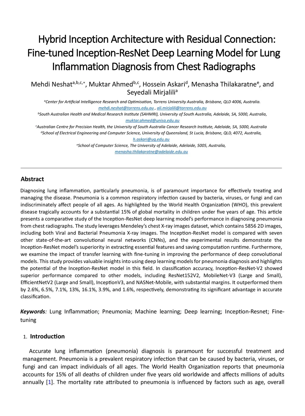 Diagnosing lung inflammation, particularly pneumonia, is of paramount importance for effectively treating and managing the disease. Pneumonia is a common respiratory infection caused by bacteria, viruses, or fungi and can indiscriminately affect people of all ages. As highlighted by the World Health Organization (WHO), this prevalent disease tragically accounts for a substantial 15% of global mortality in children under five years of age. This article presents a comparative study of the Inception-ResNet deep learning model's performance in diagnosing pneumonia from chest radiographs. The study leverages Mendeleys chest X-ray images dataset, which contains 5856 2D images, including both Viral and Bacterial Pneumonia X-ray images. The Inception-ResNet model is compared with seven other state-of-the-art convolutional neural networks (CNNs), and the experimental results demonstrate the Inception-ResNet model's superiority in extracting essential features and saving computation runtime. Furthermore, we examine the impact of transfer learning with fine-tuning in improving the performance of deep convolutional models. This study provides valuable insights into using deep learning models for pneumonia diagnosis and highlights the potential of the Inception-ResNet model in this field. In classification accuracy, Inception-ResNet-V2 showed superior performance compared to other models, including ResNet152V2, MobileNet-V3 (Large and Small), EfficientNetV2 (Large and Small), InceptionV3, and NASNet-Mobile, with substantial margins. It outperformed them by 2.6%, 6.5%, 7.1%, 13%, 16.1%, 3.9%, and 1.6%, respectively, demonstrating its significant advantage in accurate classification.